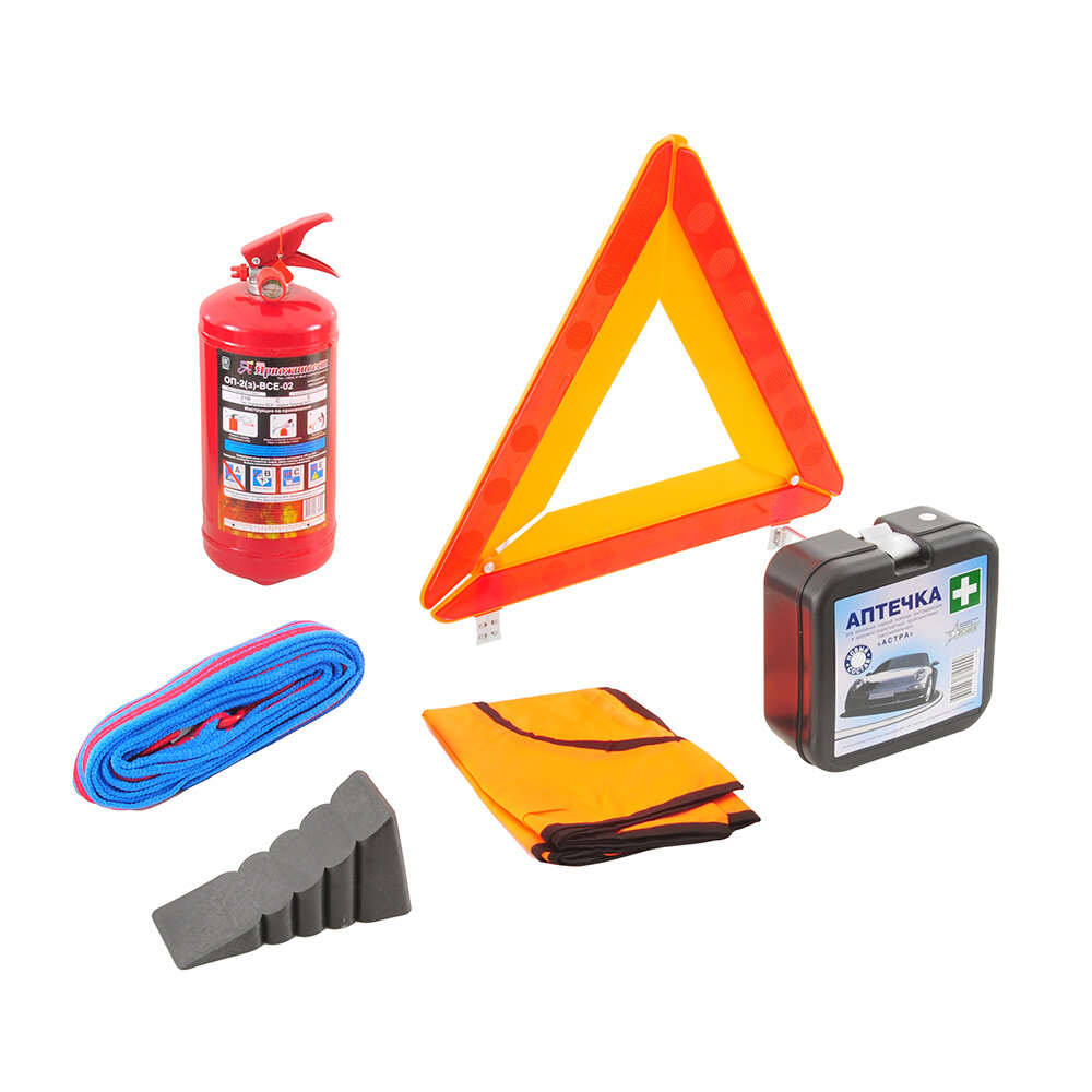 | В наборе | аптечка / жилет светоотражающий / знак аварийной остановки / огнетушитель / трос буксировочный |