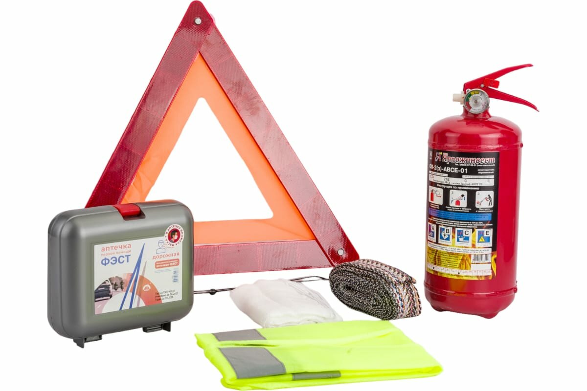 | Подробная комплектация | 1) Аптечка первой помощи дорожная «ФЭСТ» 2) Огнетушитель металлический с манометром ОП-2(з) 3) Знак аварийной остановки 4) Трос буксировочный с петлями 3,5 т 5) Жилет сигнальный 6) Сумка-футляр |
