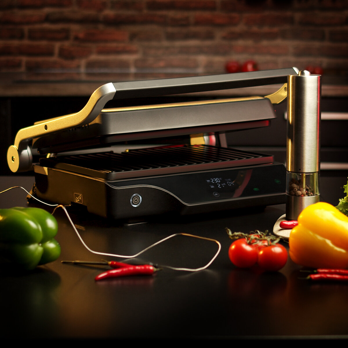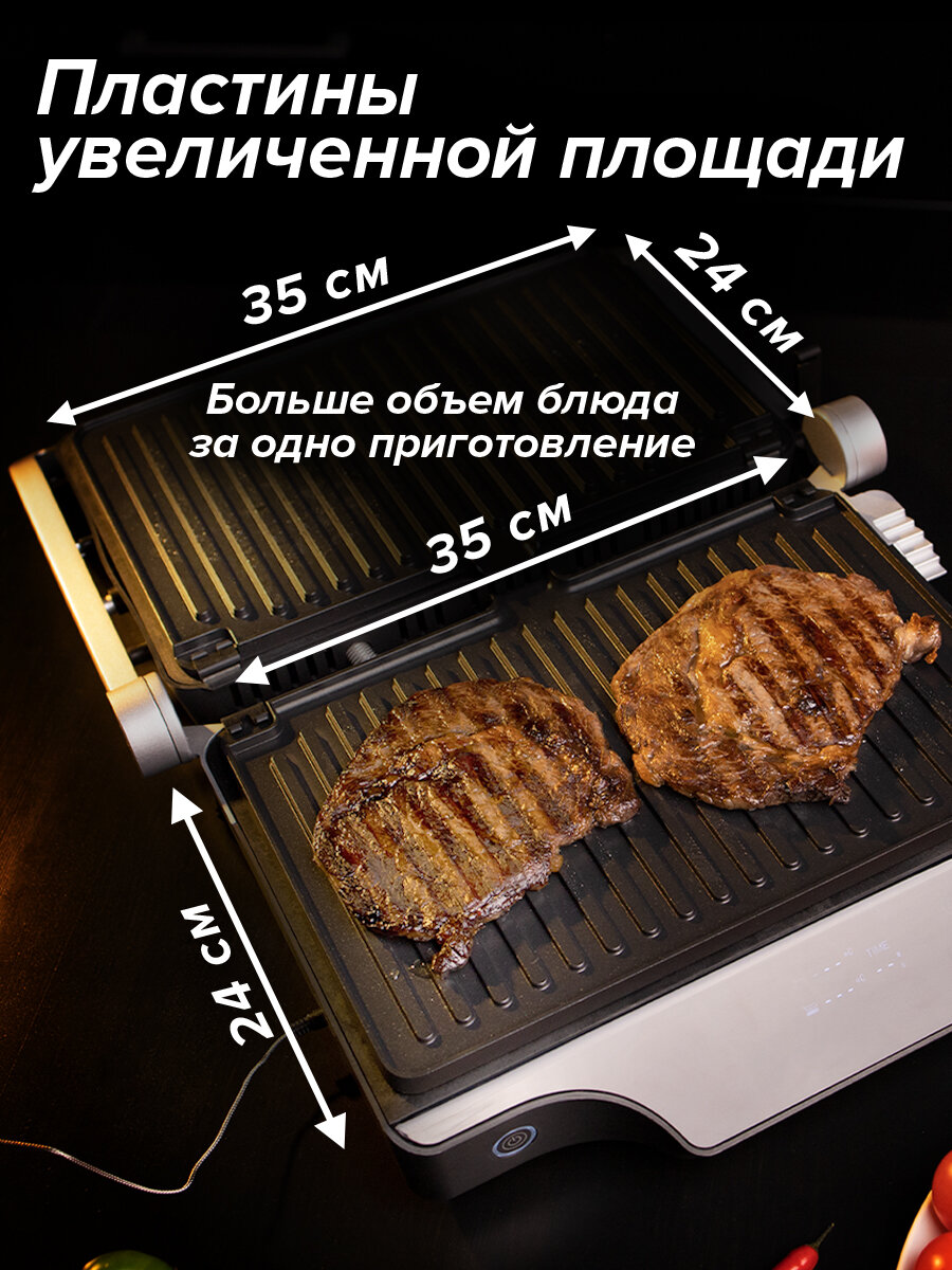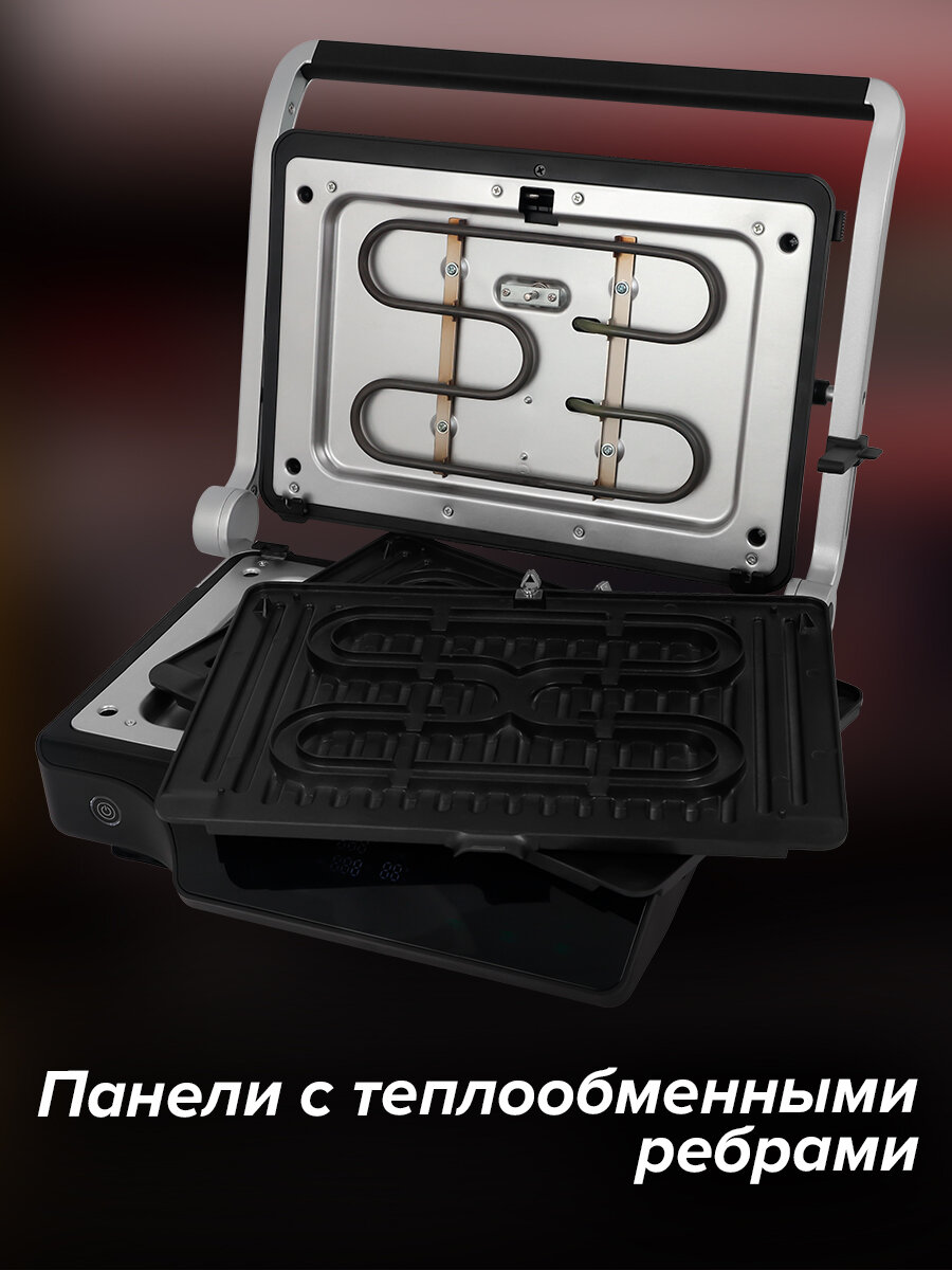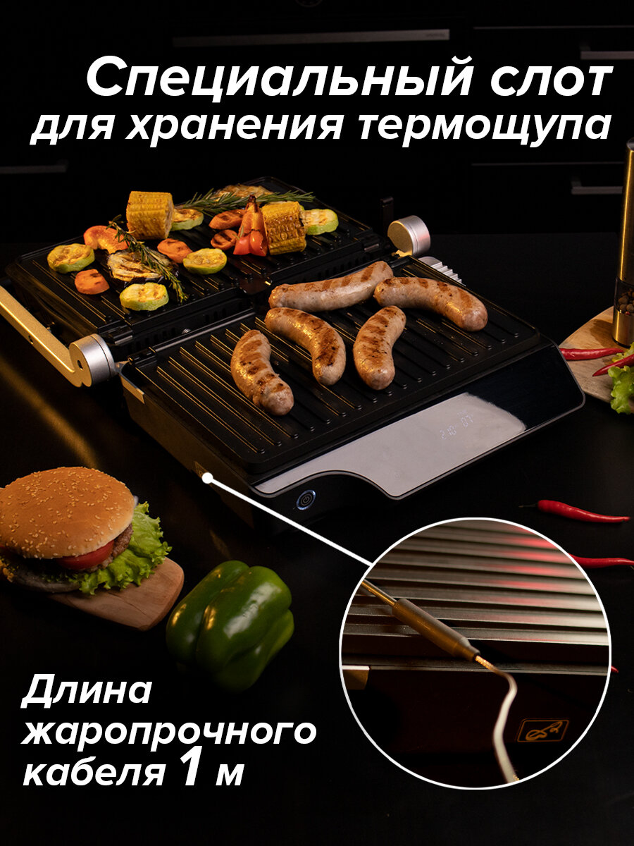 | Особенности | антипригарное покрытие / контактный гриль / поддон для сбора жира / регулировка высоты верхней панели / съемные пластины / термощуп |