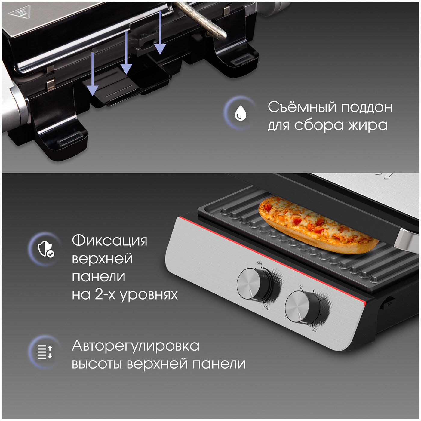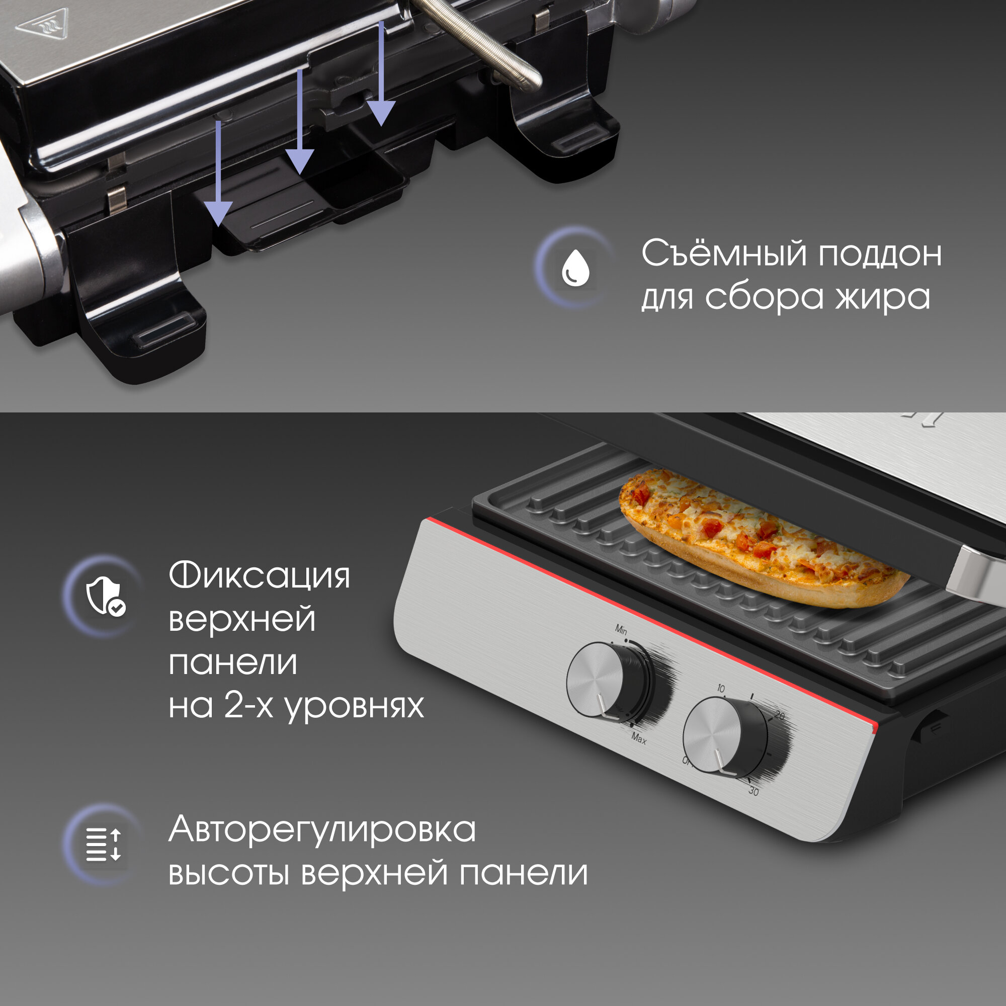 | Особенности | антипригарное покрытие / контактный гриль / поддон для сбора жира / регулировка высоты верхней панели / съемные пластины |