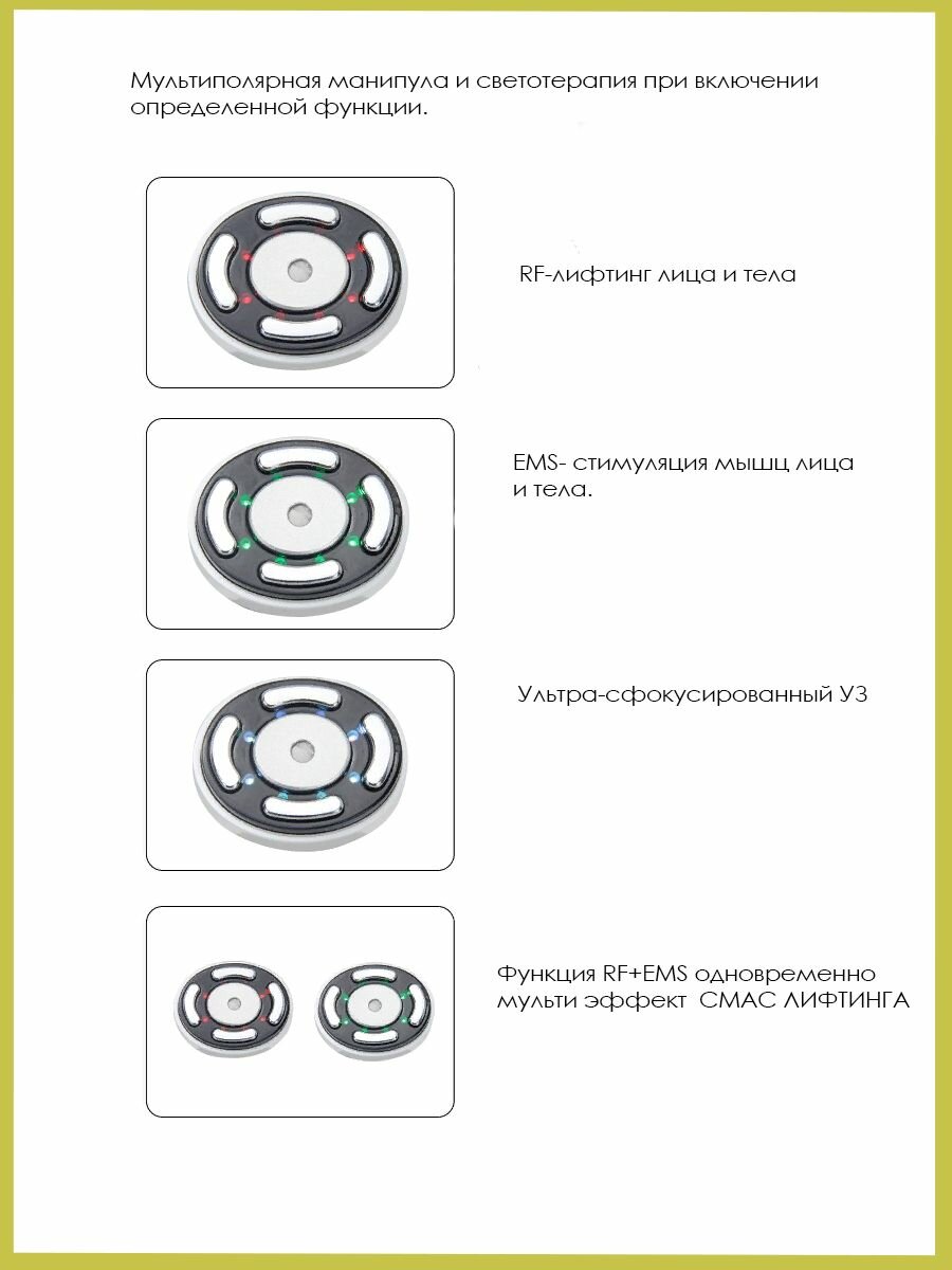 | Принцип работы | RF-лифтинг / микротоки / миостимуляция / светотерапия |