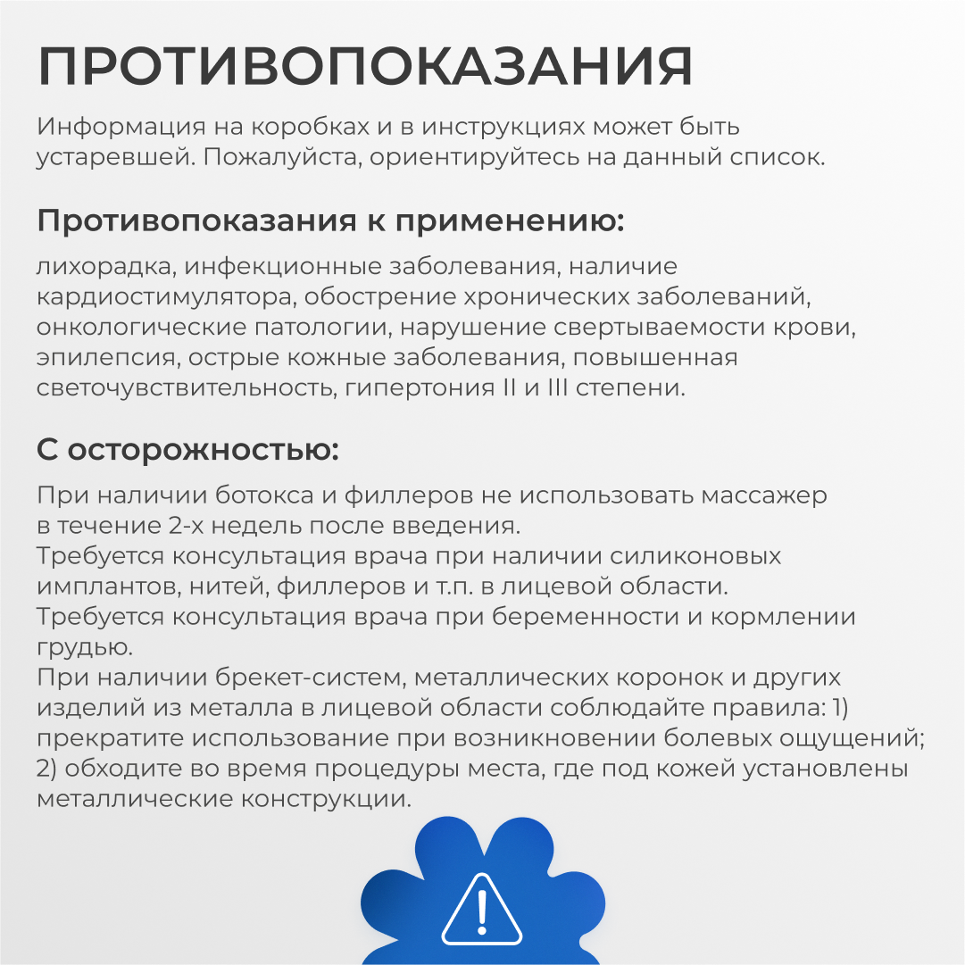| Дополнительная информация | С осторожностью: При наличии ботокса и филлеров не использовать массажер в течение 2-х недель после введения. Требуется консультация врача при наличии силиконовых имплантов, нитей, филлеров и т.п. в лицевой области. Требуется консультация врача при беременности и кормлении грудью. При наличии брекет-систем, металлических коронок и других изделий из металла в лицевой области соблюдайте правила: 1) прекратите использование при возникновении болевых ощущений; 2) обходите во время процедуры места, где под кожей установлены металлические конструкции. |