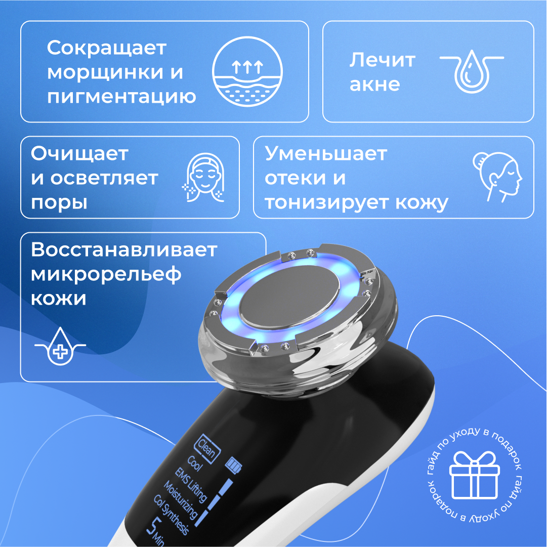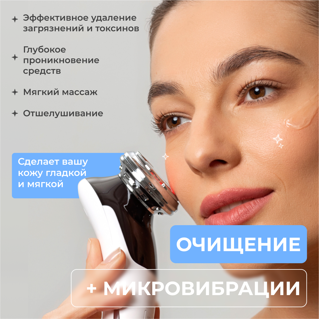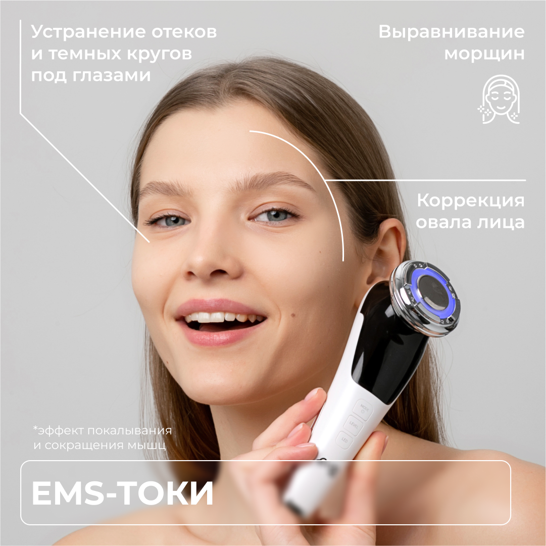 | Принцип работы | RF-лифтинг / вибрация / микротоки / миостимуляция / пилинг / светотерапия / ультразвук / фонофорез / электропорация |