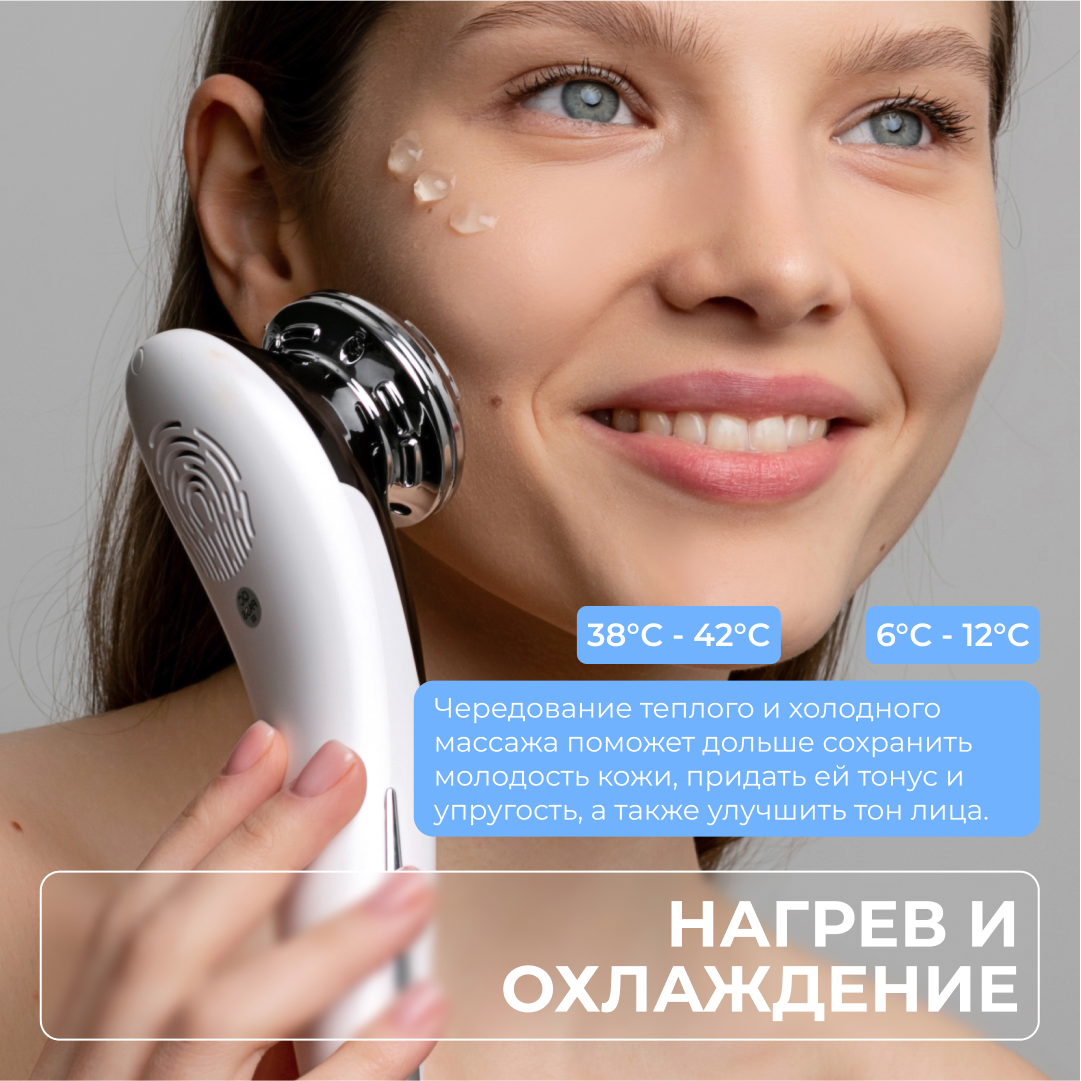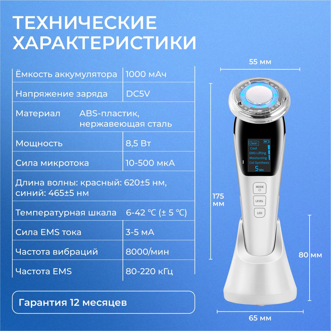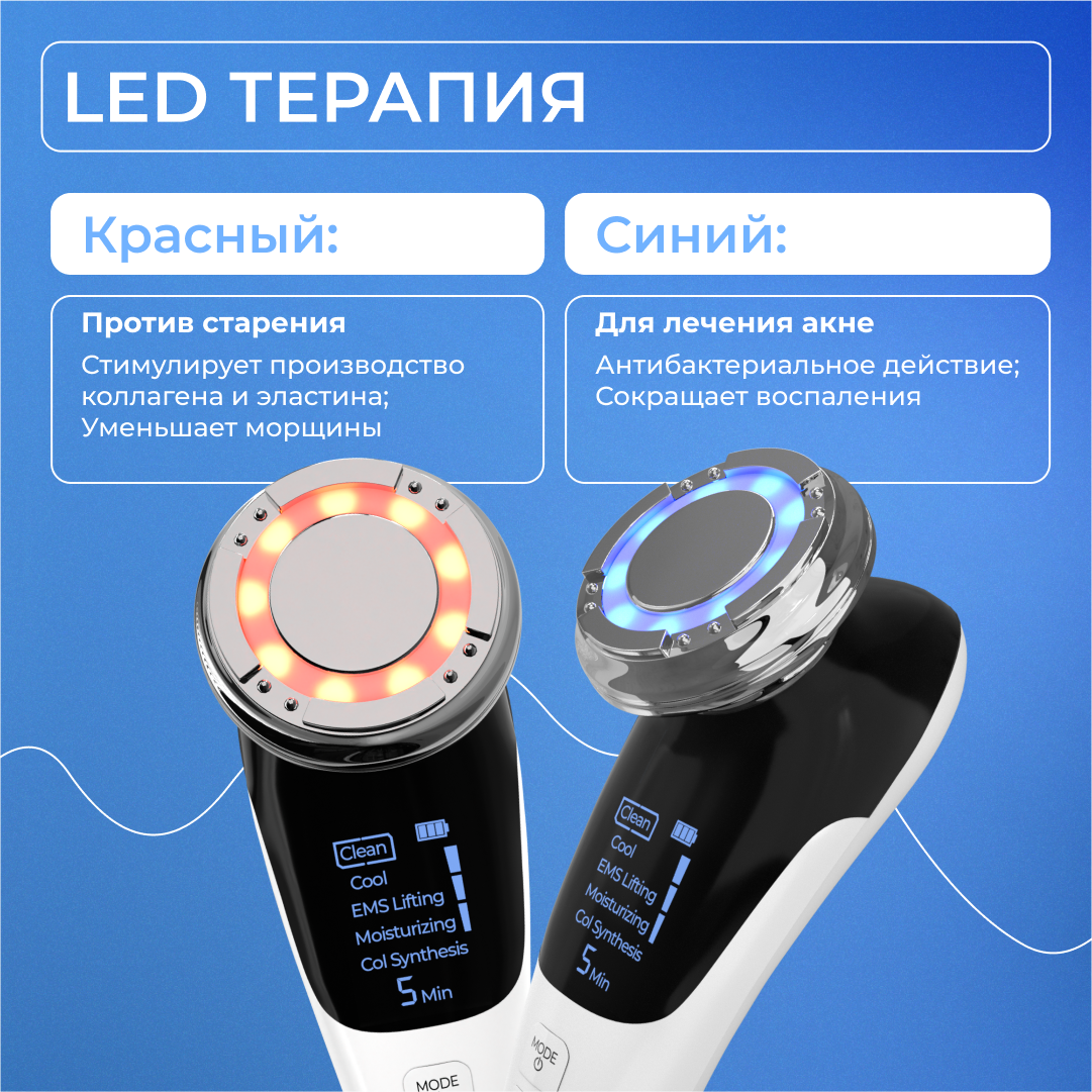 | Принцип работы | RF-лифтинг / вибрация / микротоки / миостимуляция / пилинг / светотерапия / ультразвук / фонофорез / электропорация |