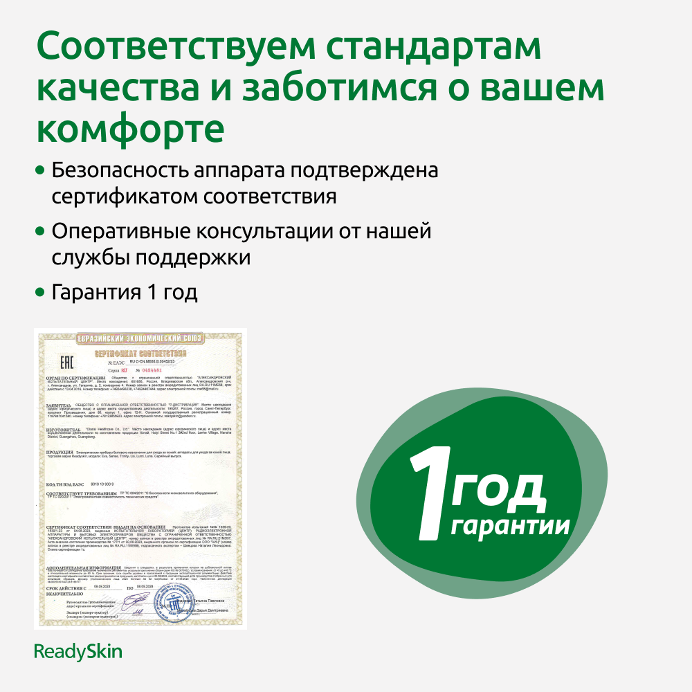 | Комплектность | Аппарат для ухода за кожей лица, Зарядная база, Адаптер питания, Инструкция на русском языке, Пробник контактного геля ReadySkin Care Lifting gel |