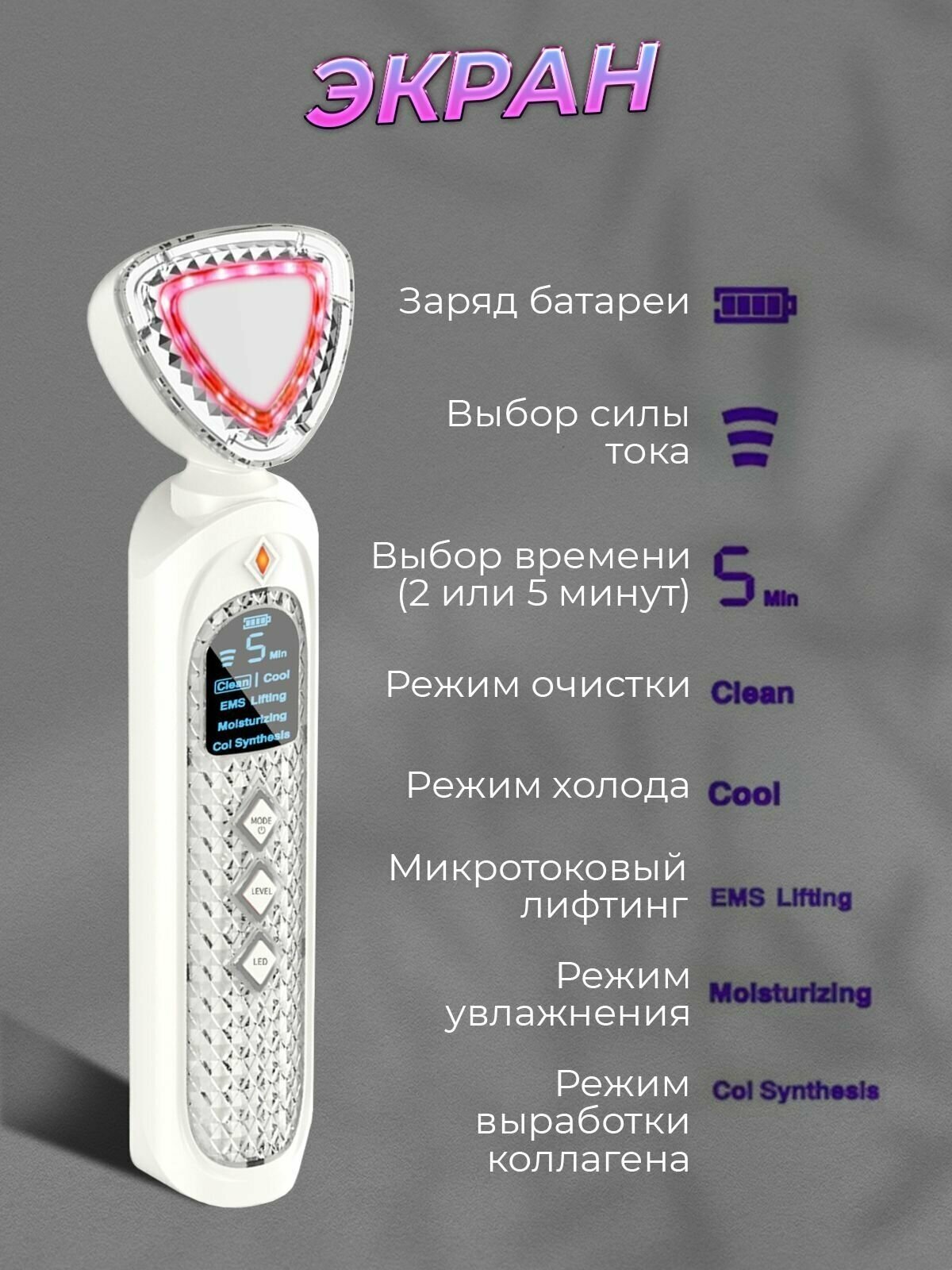 | Принцип работы | RF-лифтинг / вибрация / инфракрасное излучение / микротоки / миостимуляция |