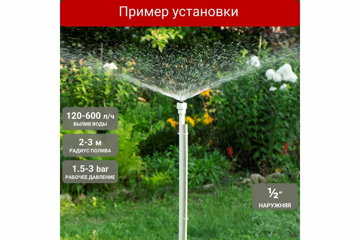 | Комплектация | Разбрызгиватель регулируемый 1/2" нар, вылив 120-520 л/ч, радиус 2-3м |