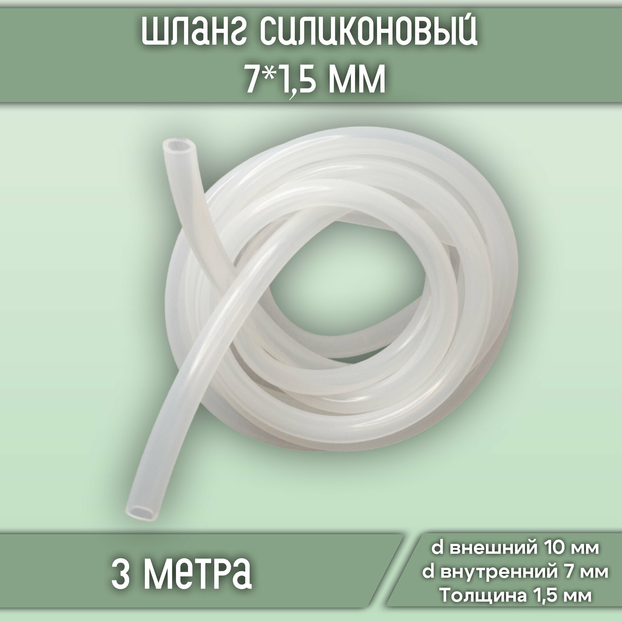 | Комплектация | Шланг (трубка) силиконовый универсальный пищевой 7*1,5 мм (длина 3 метра) - 1 штука. |