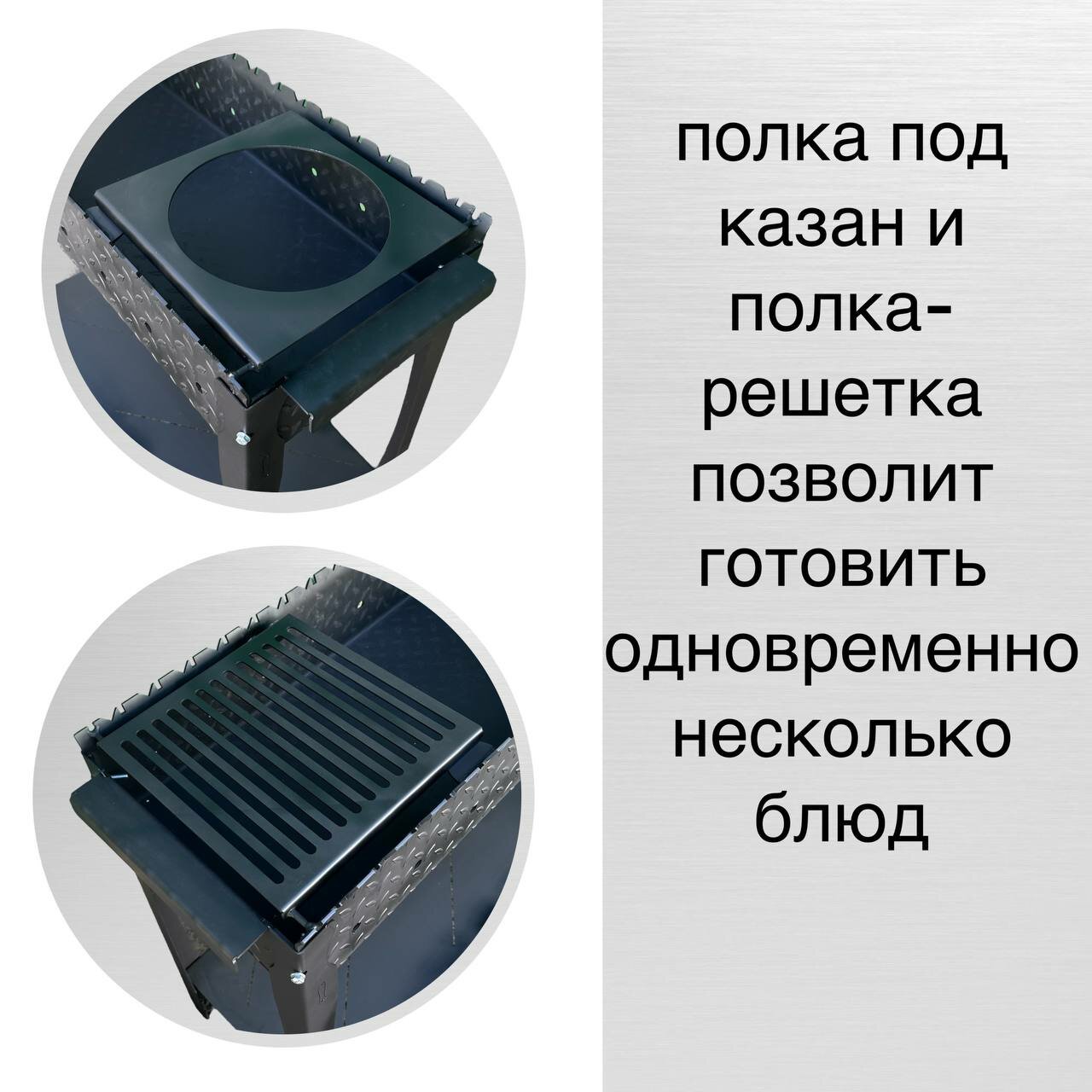 Мангал разборный 800 мм. с полкой-решёткой, полкой под казан и полкой под дрова, сталь 3 мм. интересное: