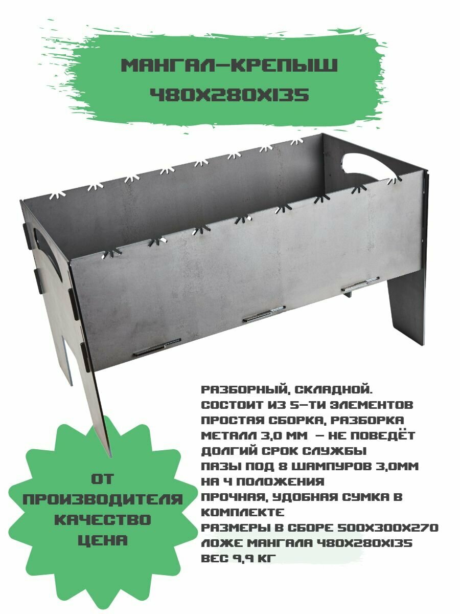 Ниже Вы можете прочитать отзывы на Мангал Крепыш 480х280х135, ознакомится с подробными характеристиками, посмотреть интересные обзоры и фотографии на Мангал Крепыш 480х280х135.