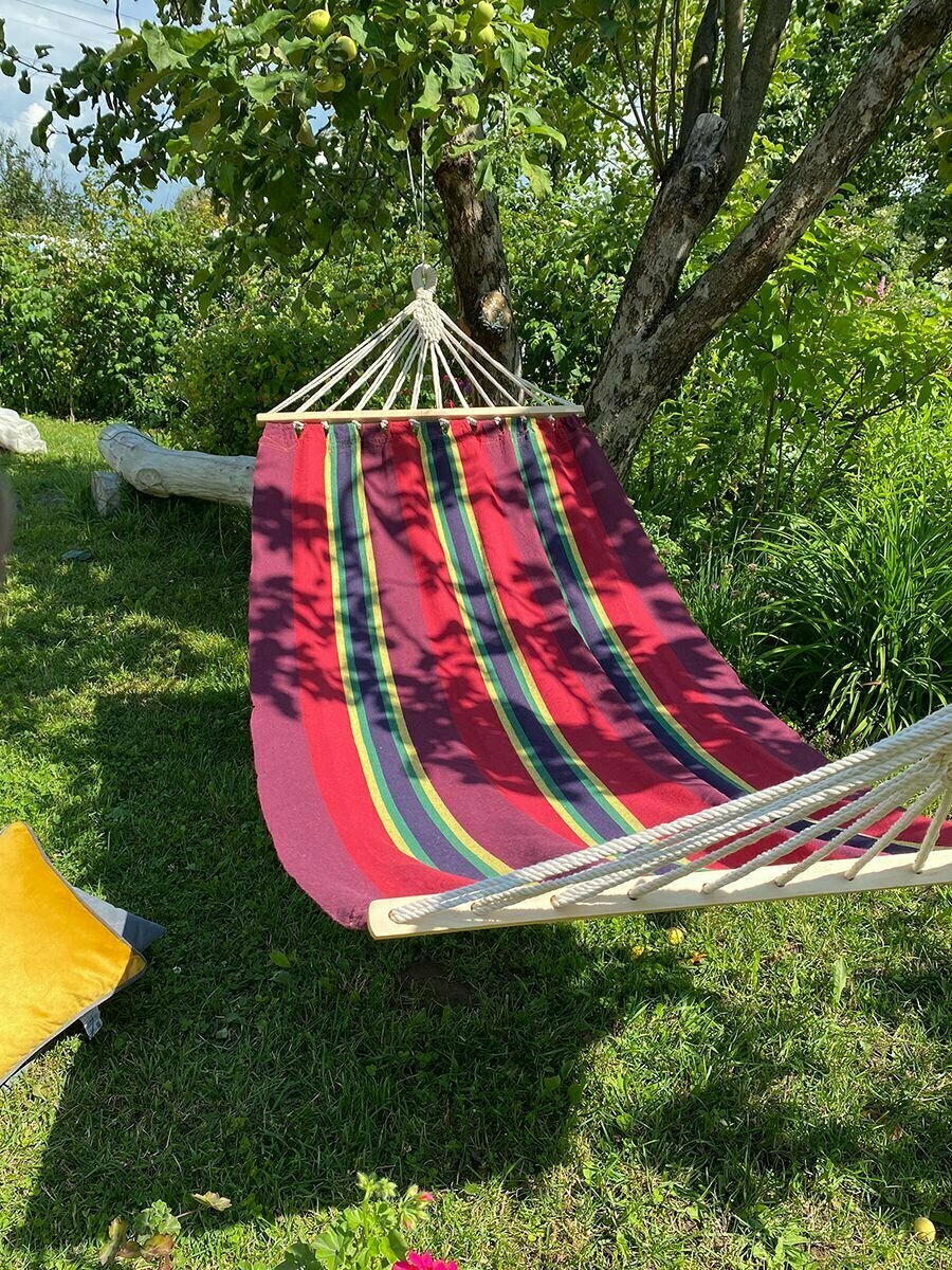 Гамак подвесной для дома и дачи гелеос ГП201020, размер 200х100см, с деревянной планкой, хлопок, красно-фиолетовый интересное: