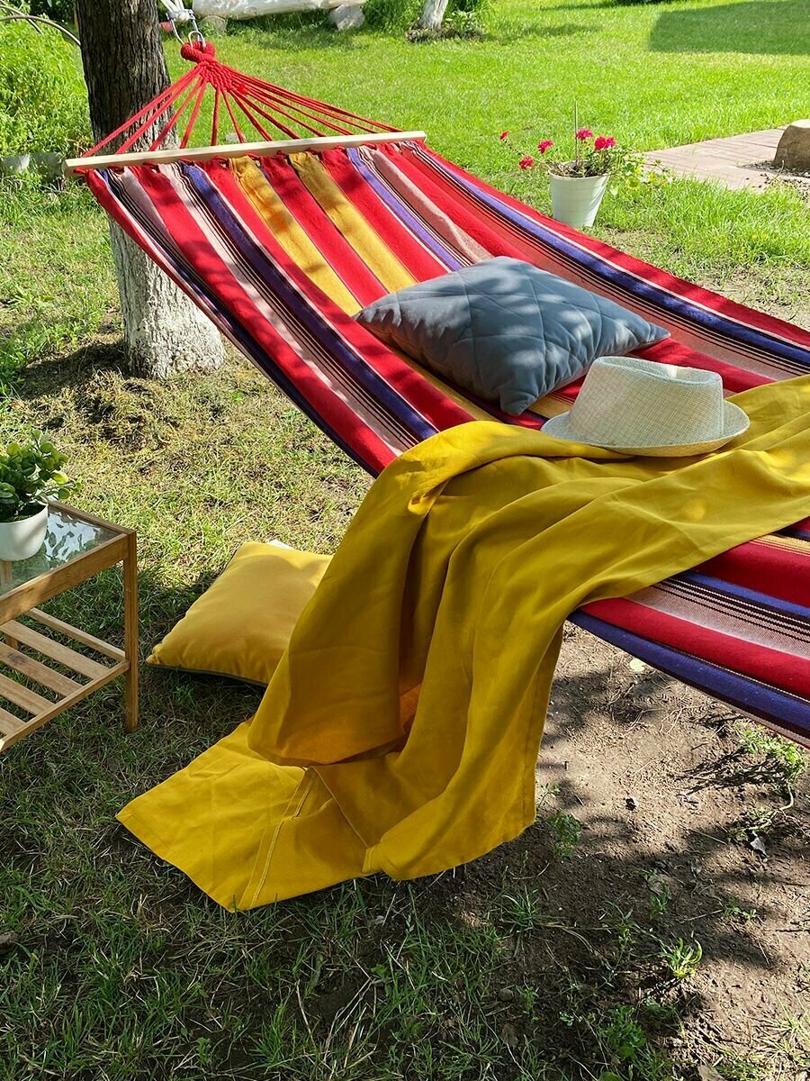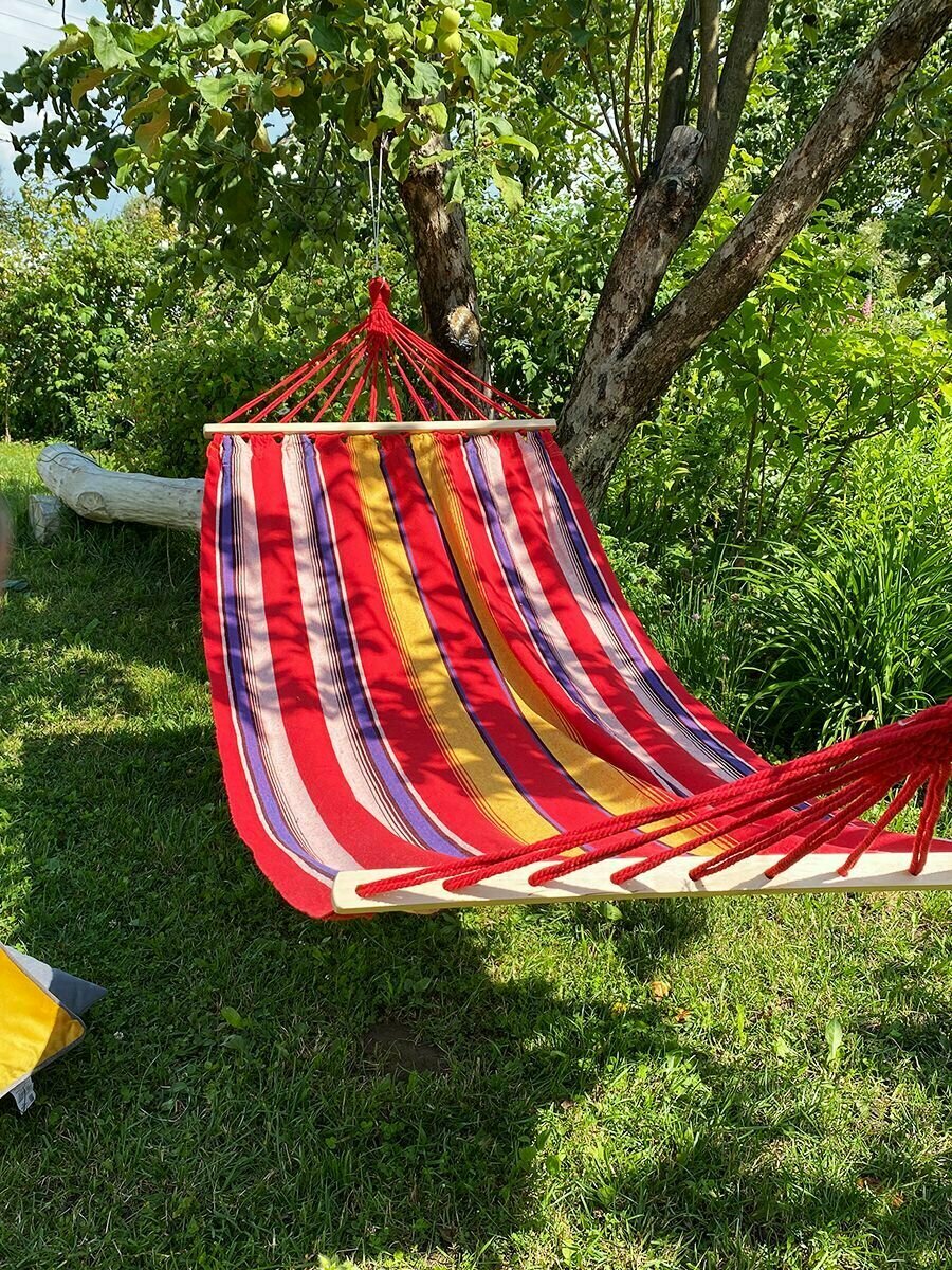 Гамак подвесной для дома и дачи гелеос ГП201020, размер 200х100см, с деревянной планкой, хлопок, красно-желто-синий интересное: