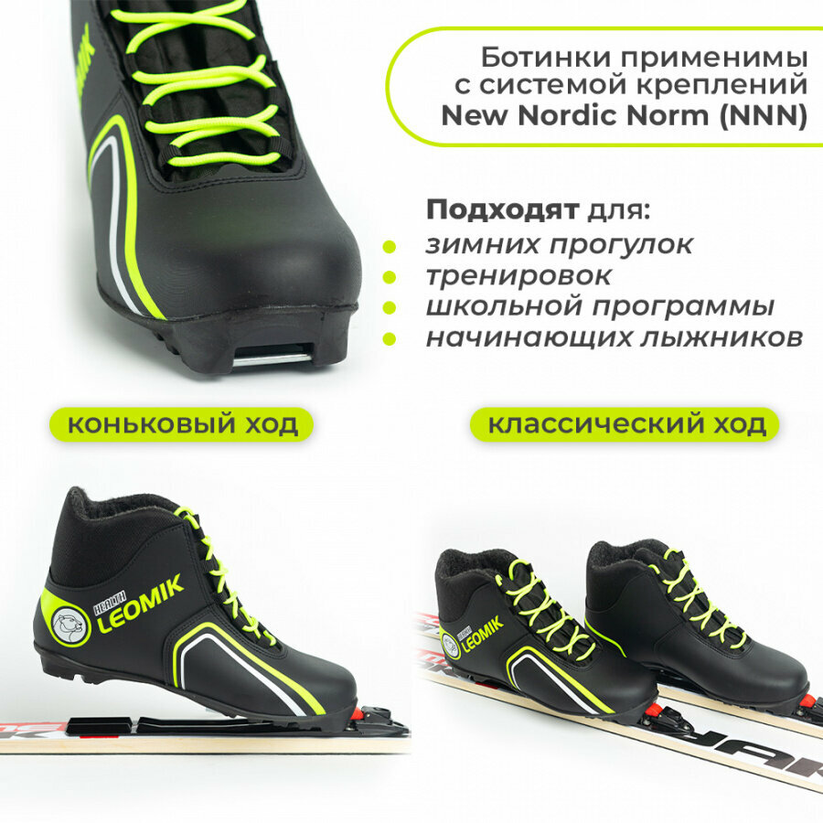Ботинки лыжные Leomik Health (green) NNN, размер 34, черно-неоновые