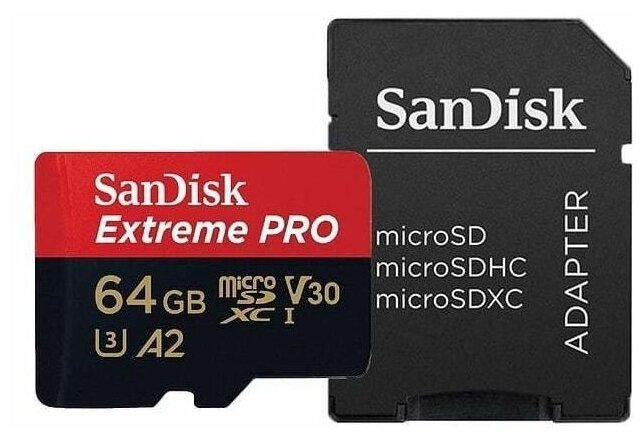 Карта памяти SanDisk Extreme PRO microSDXC 64 ГБ Class 10 UHS-I U3, V30, A2 (R/W 200/90 Mb/s) + SD адаптер