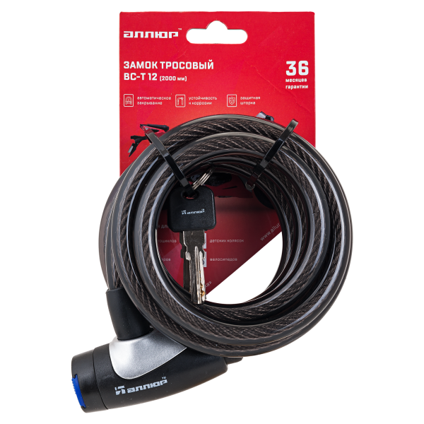 Купить Замок тросовый с ключом для велосипеда, самоката, коляски, Аллюр, 2000*12 мм, черный
