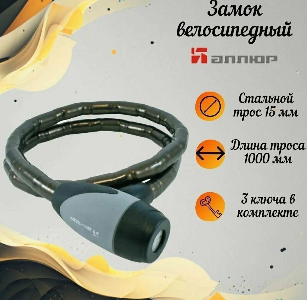 Замок для велосипеда с тросом аллюр ВС-Т 15, длина 1 метр, толщина крученого троса 15 мм., три ключа интересное: