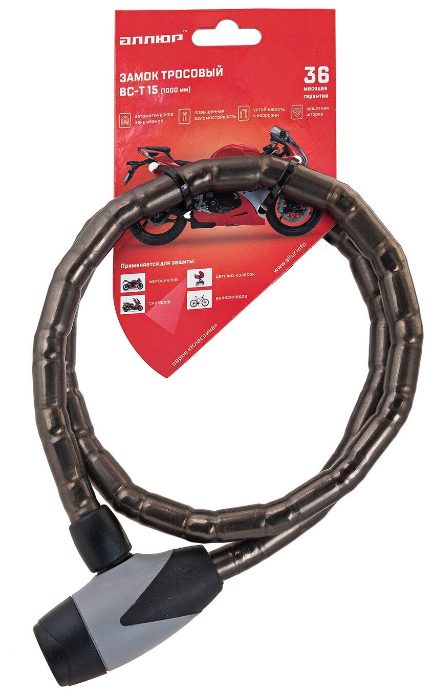 Купить Замок для велосипеда с тросом аллюр ВС-Т 15, длина 1 метр, толщина крученого троса 15 мм., три ключа