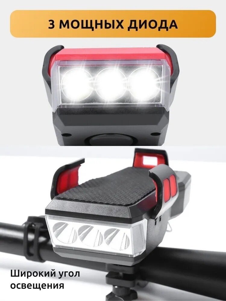 Фонарь велосипедный аккумуляторный светодиодный передний с держателем для телефона/Велофонарь с сигналом/гудком/на руль/повербанк/powerbank интересное: