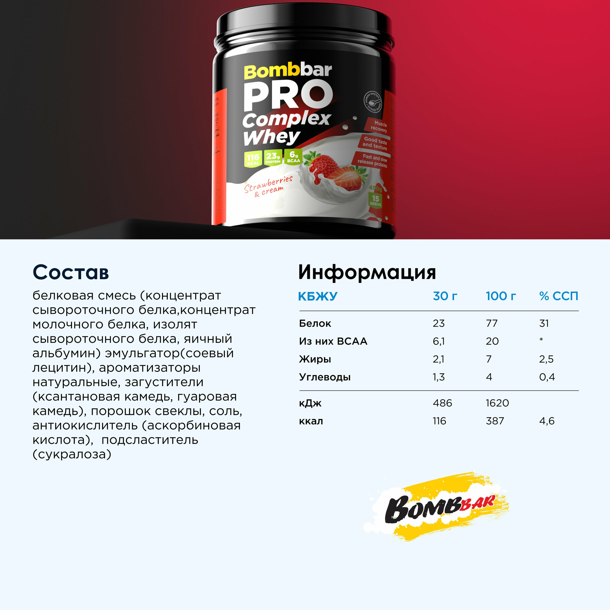 Протеин сывороточный BOMBBAR Pro Complex Whey, 450 г, вкус: клубника со сливками