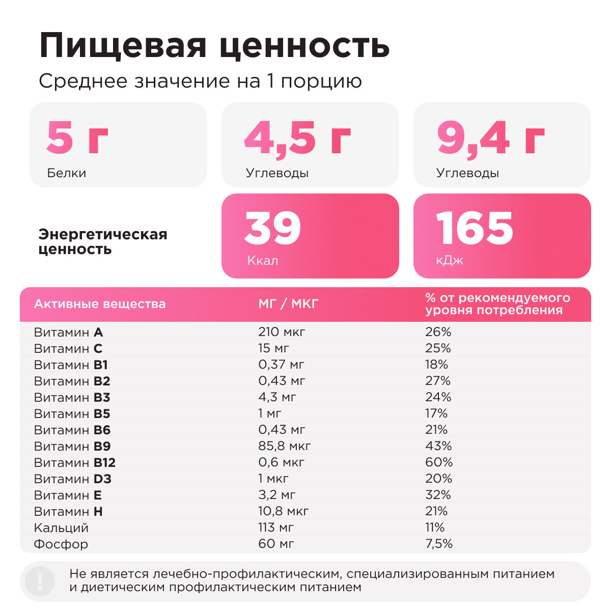 | Состав | фруктоза, мальтодекстрин, овсяное толокно, изолят соевого белка, семена чиа, гуаровая камедь, бамбуковые волокна, овсяные волокна, пшеничная клетчатка, ароматизатор, трикальцийфосфат (трикафос), конжаковая камедь, баобаба, витаминный премикс (A, Д3, Е, С, Н, В1, В2, В6, В9, В12), экстракт семян гуараны, порошок баобаба, ароматизатор согласно выбранному вкусу |