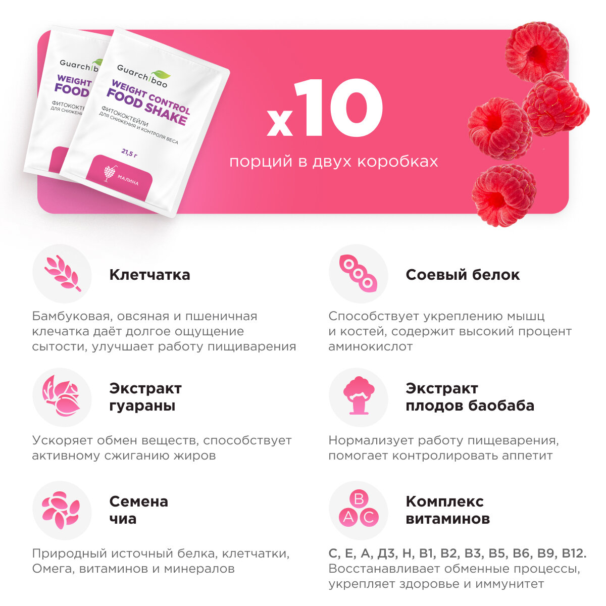 Купить Низкокалорийный коктейль для похудения Guarchibao с малиновым вкусом 2 упаковки 10 порций