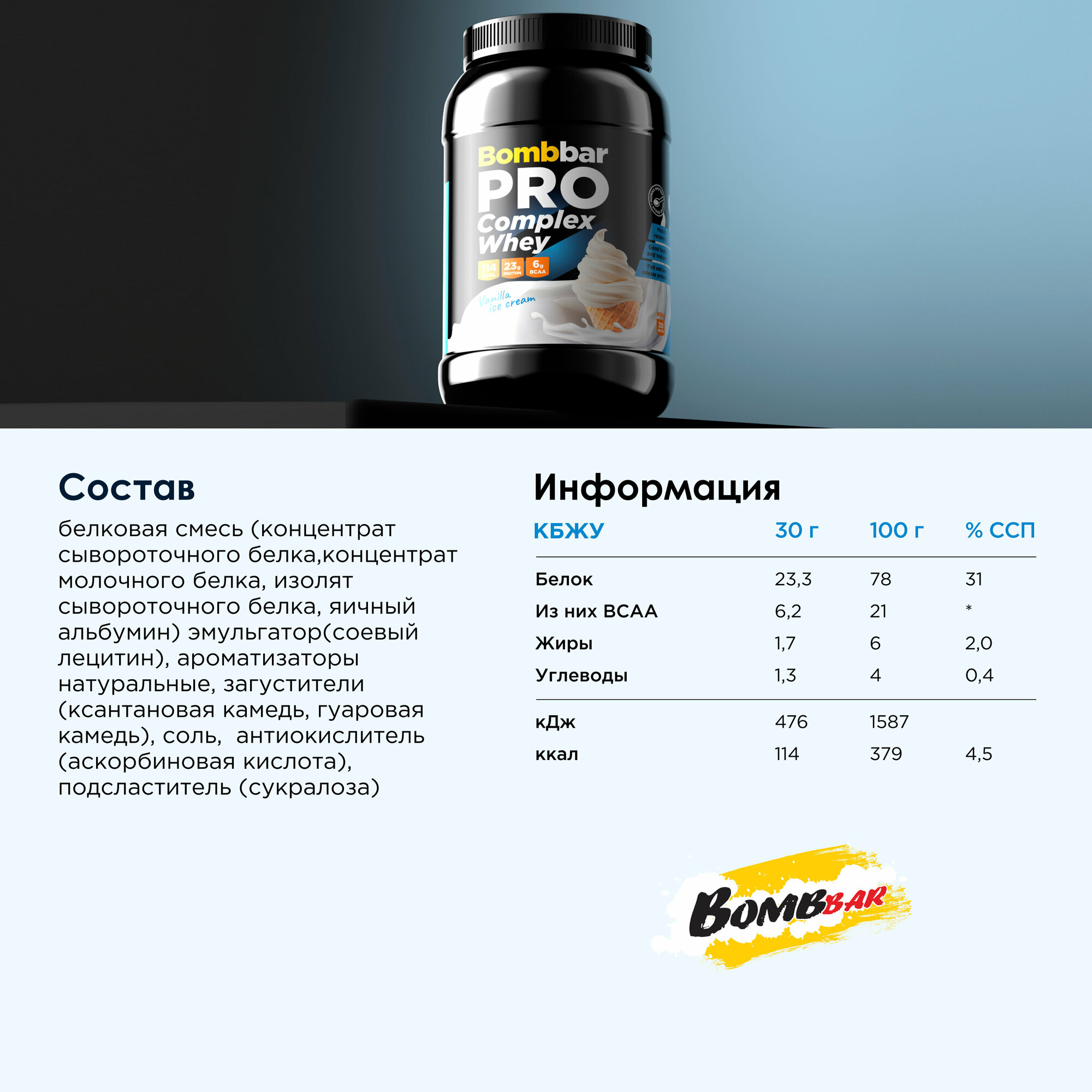 Купить Bombbar Pro Complex Whey Многокомпонентный протеин "Ваниль и мороженое", 900г