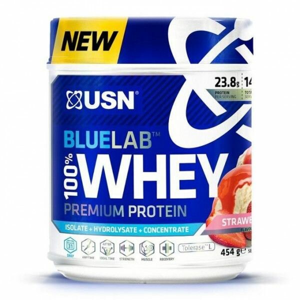 Купить USN BlueLab 100% Premium Whey Straw блюлаб 100% ВЕЙ премиум протеин со вкусом клубники, порошок, 454 гр