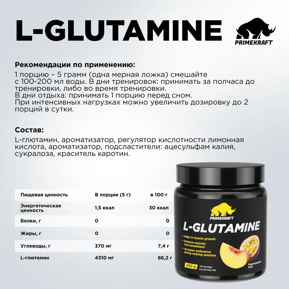 Prime Kraft L-Glutamine, L-Глютамин 200 грамм, Персик-Маракуйя