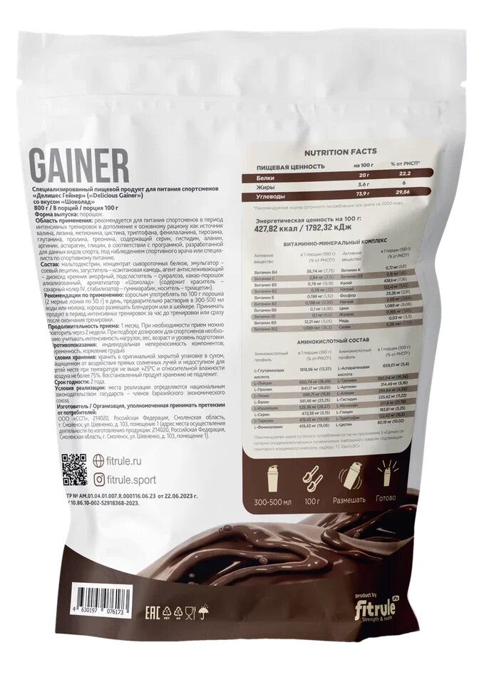 Fitrule Gainer Шоколад 800 гр - гейнер для набора массы интересное: