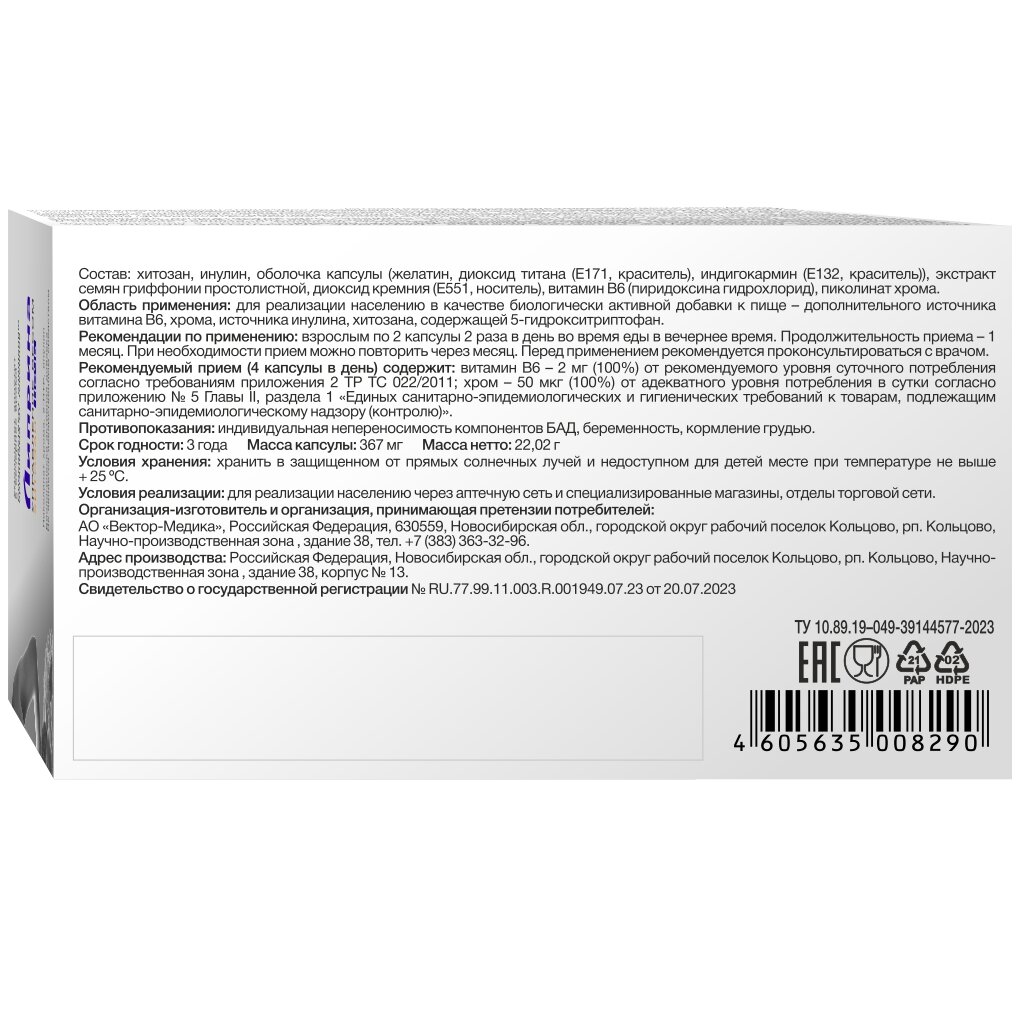 | Дополнительная информация | Уникальный комплекс на основе хитозана, инулина, экстракта семян гриффонии, витамина B6, пиколината хрома способствует комфортному снижению веса без диет и повышенных физических нагрузок. |