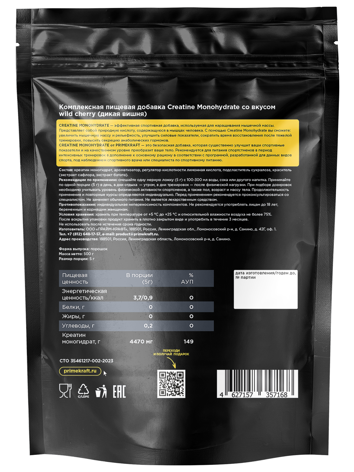 Креатин Prime Kraft Creatine Monohydrate - 500 грамм, дикая вишня