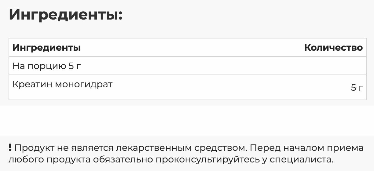 | Плюсы: | Обычный креатин моногидрат по приемлемой цене |
