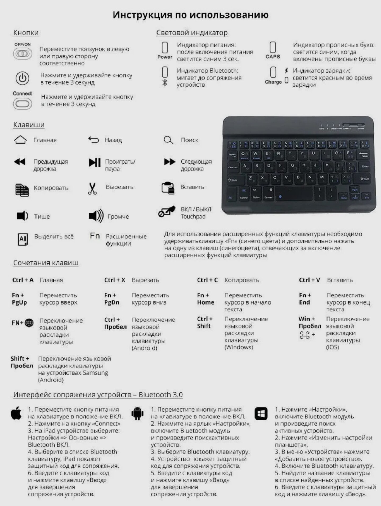 Подключается через Bluetooth, без использования дополнительных USB адаптеров и переходников. Компактность - идеально подходит к планшету. Бесшумная. Русская раскладка.