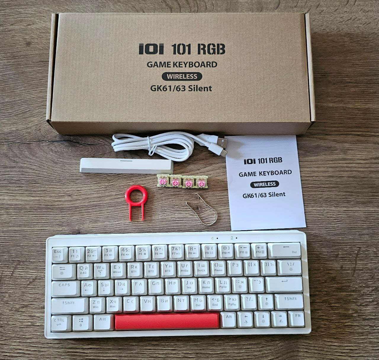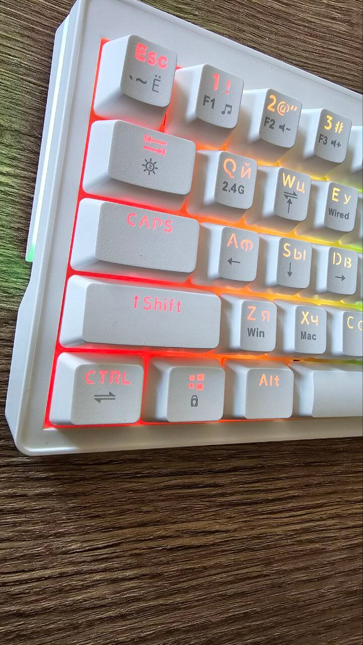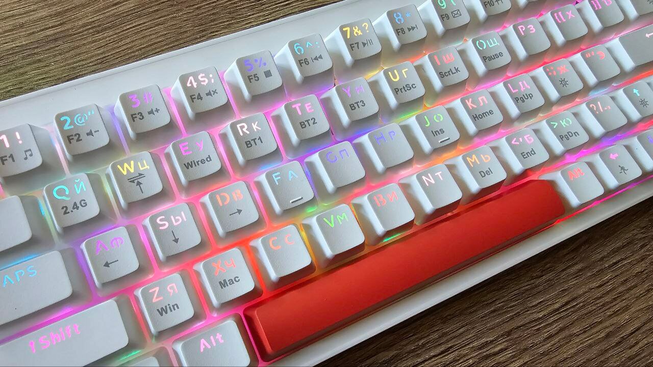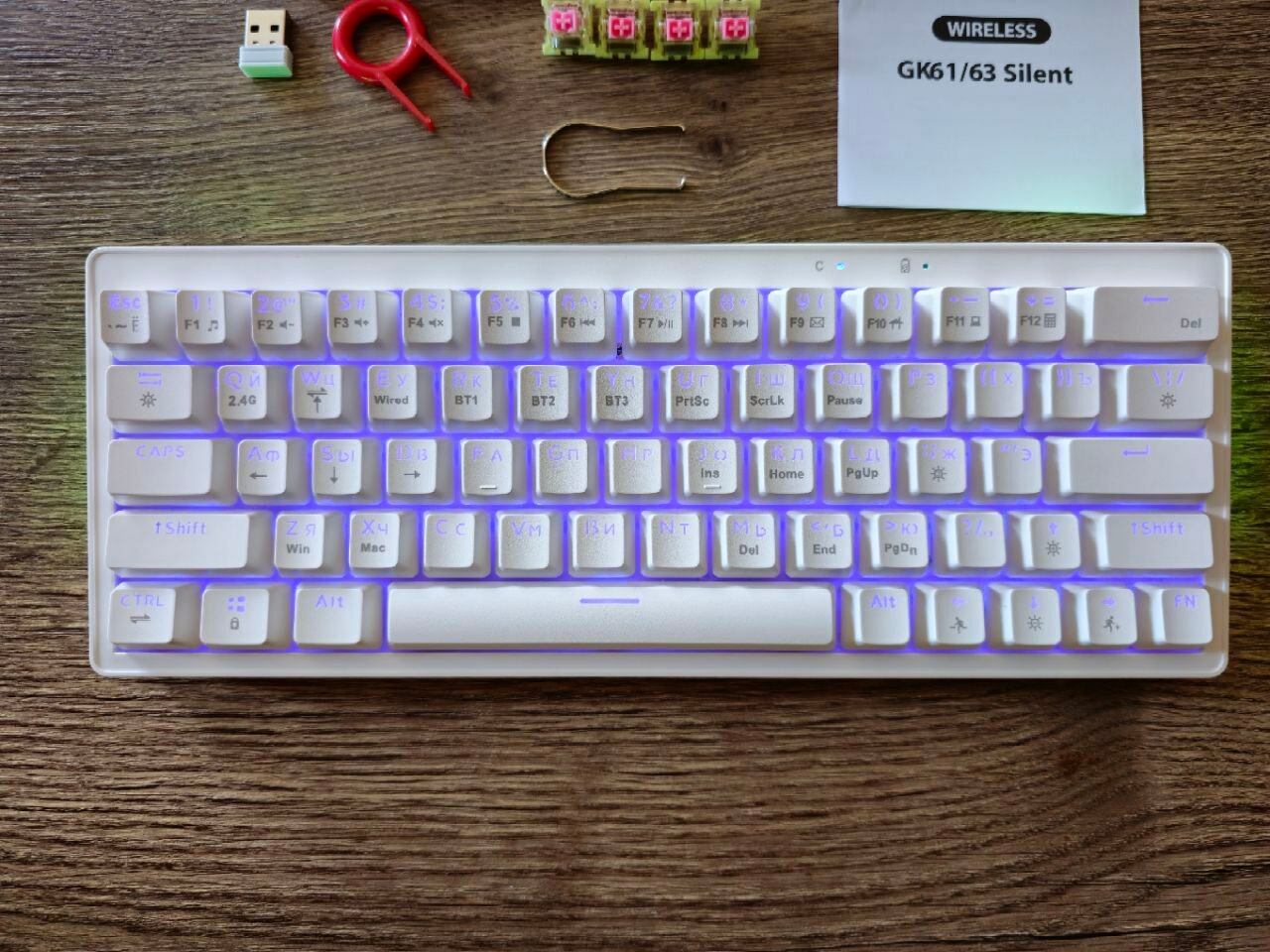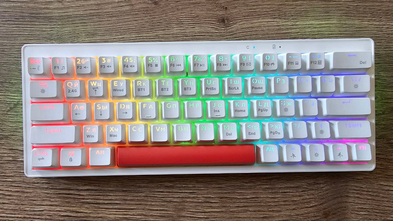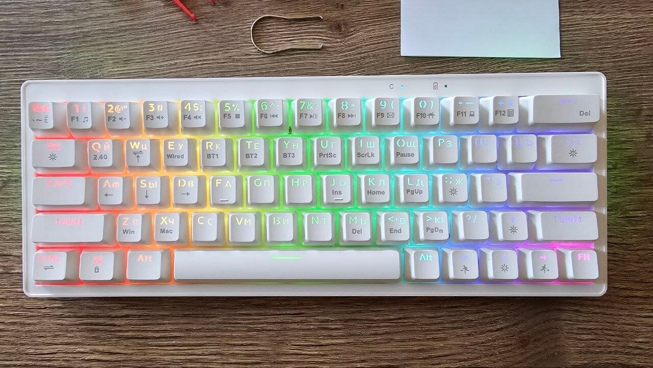 Неплохая клава за эту цену. В комплекте сьемник для кейкапов и сьемник для свитчей. Работает по провожу, блютуз или через переходник в юсб. Подсветка имеет только фиксированные цвета.