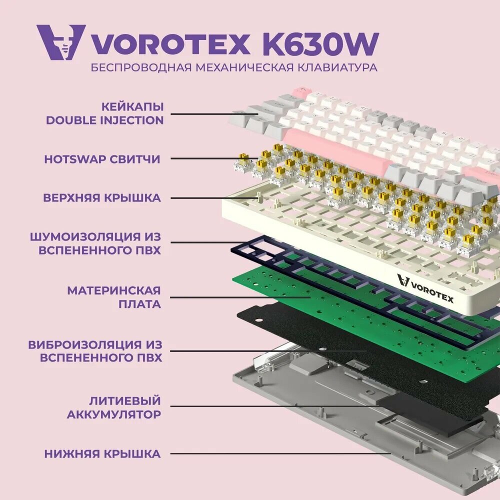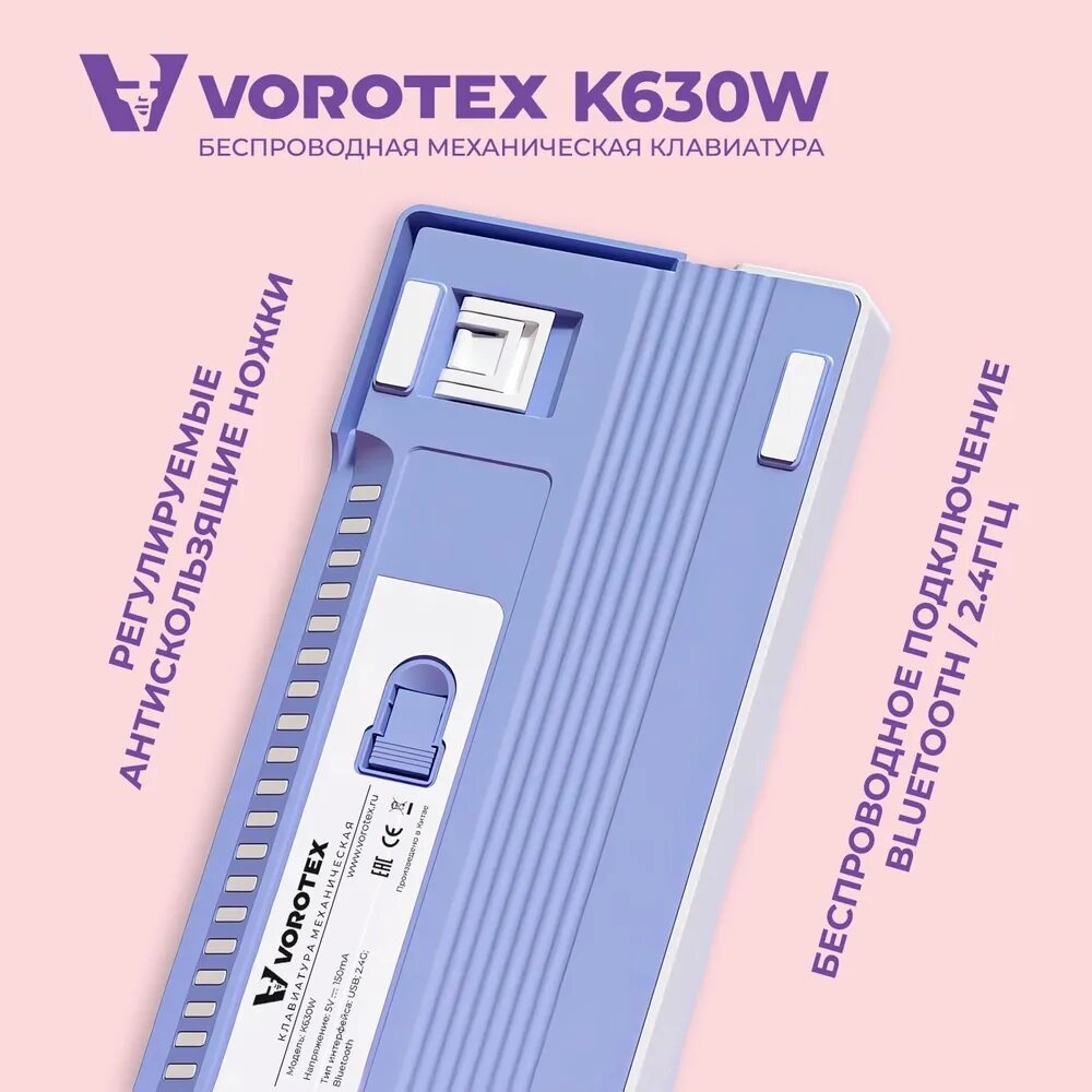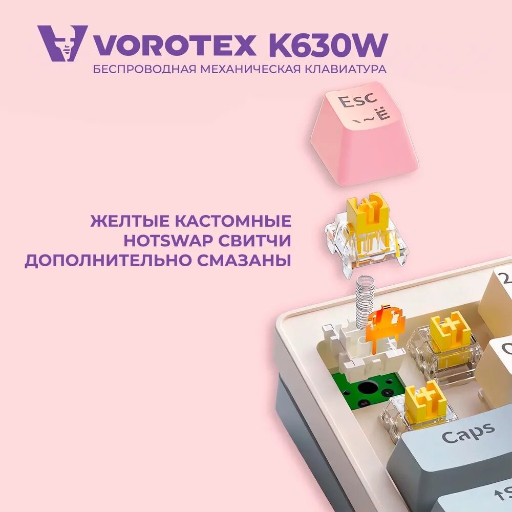 Купить Клавиатура игровая беспроводная VOROTEX K630W Yellow Switch, русская раскладка (Белый,фиолетовый)