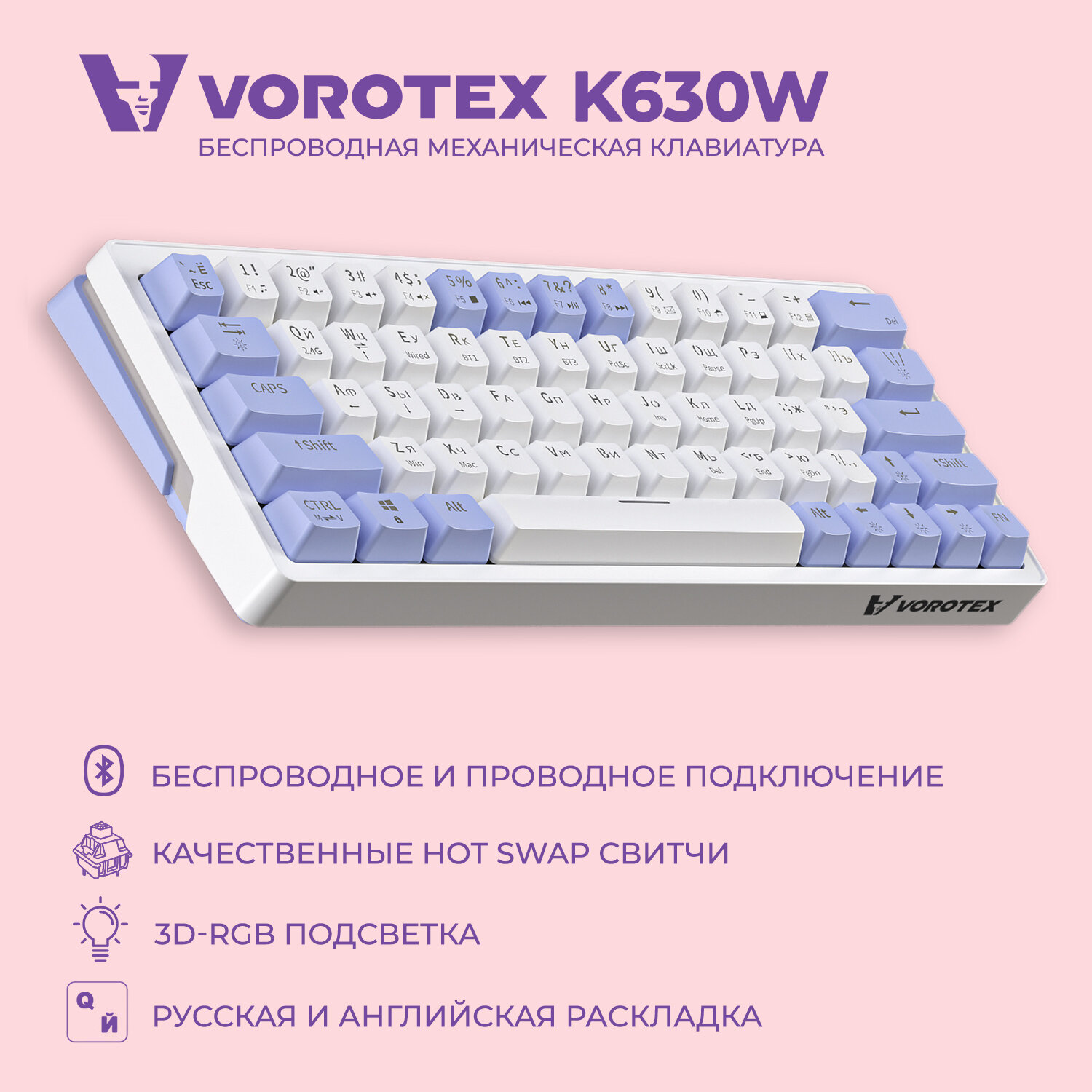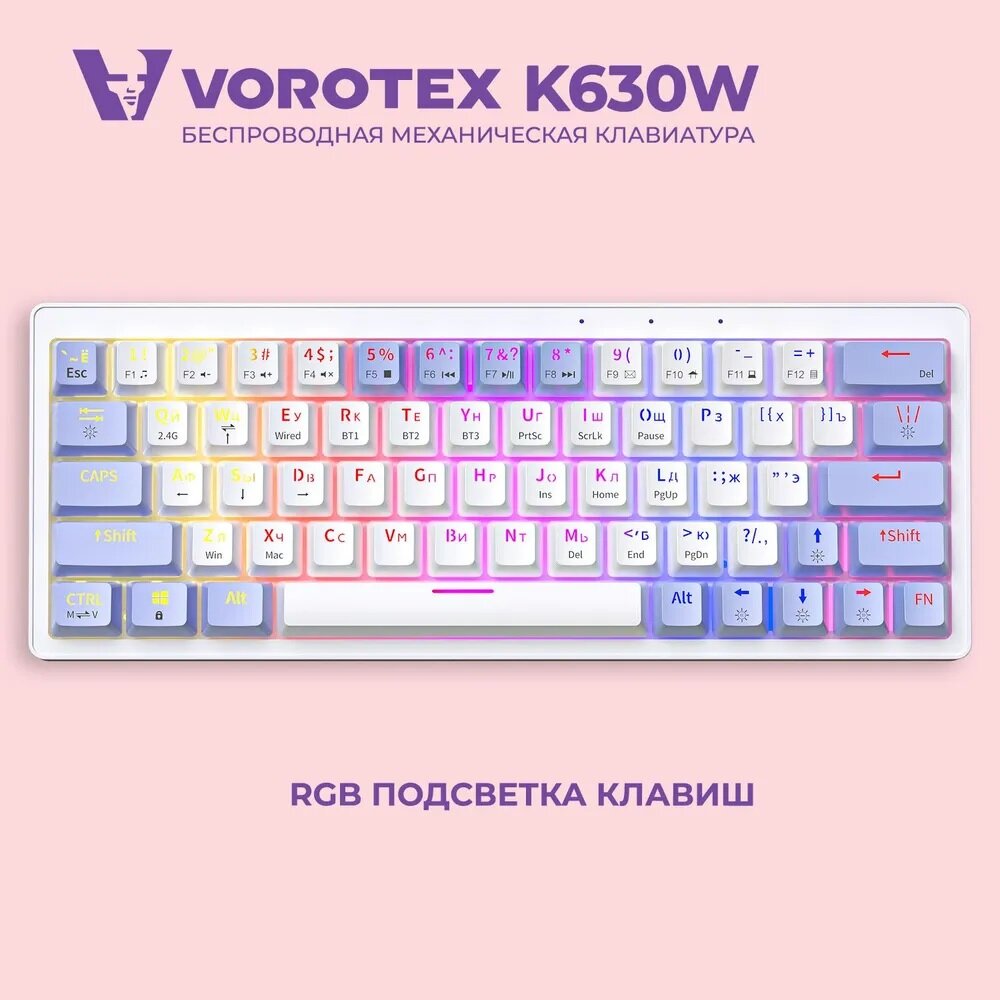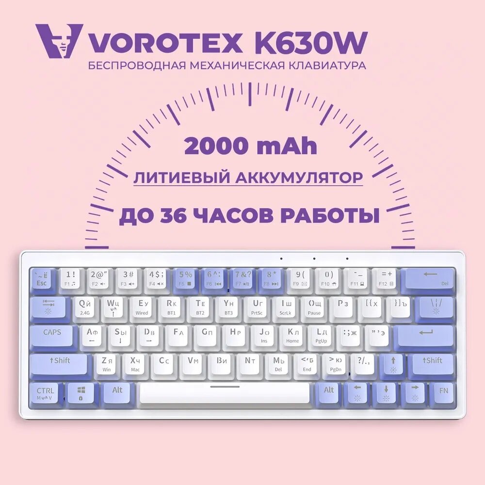 Ультракомпактная (60%) игровая беспроводная клавиатура VOROTEX K630W Yellow Switch с русской раскладкой, цвет белый/фиолетовый