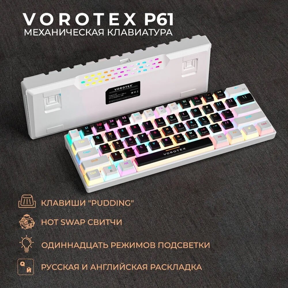 Механическая клавиатура VOROTEX P61, Hot Swap Red Switch, ультракомпактная 60%, черный/белый