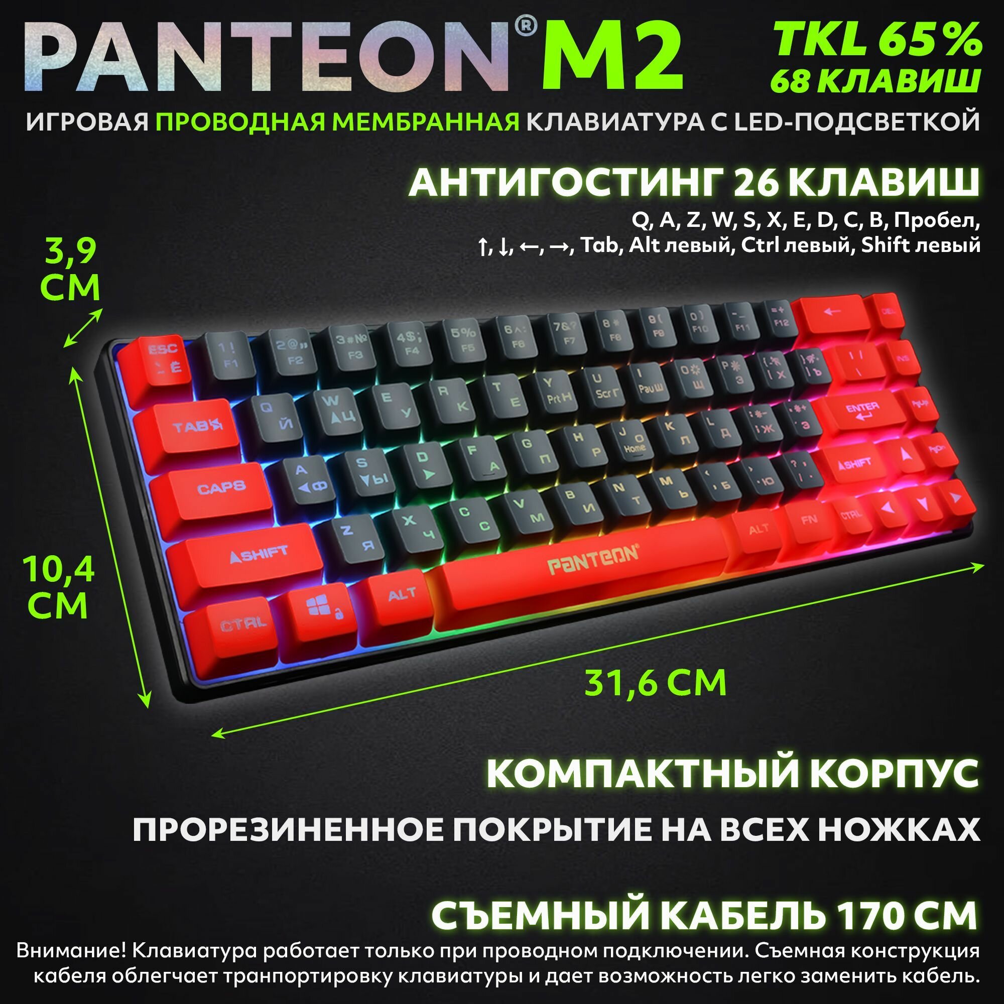 PANTEON M2 Black-Grey(04) Игровая мембранная TKL (65%) клавиатура с LED-подсветкой MULTICOLOR (68 кл, USB), цвет: черный-серый (04)