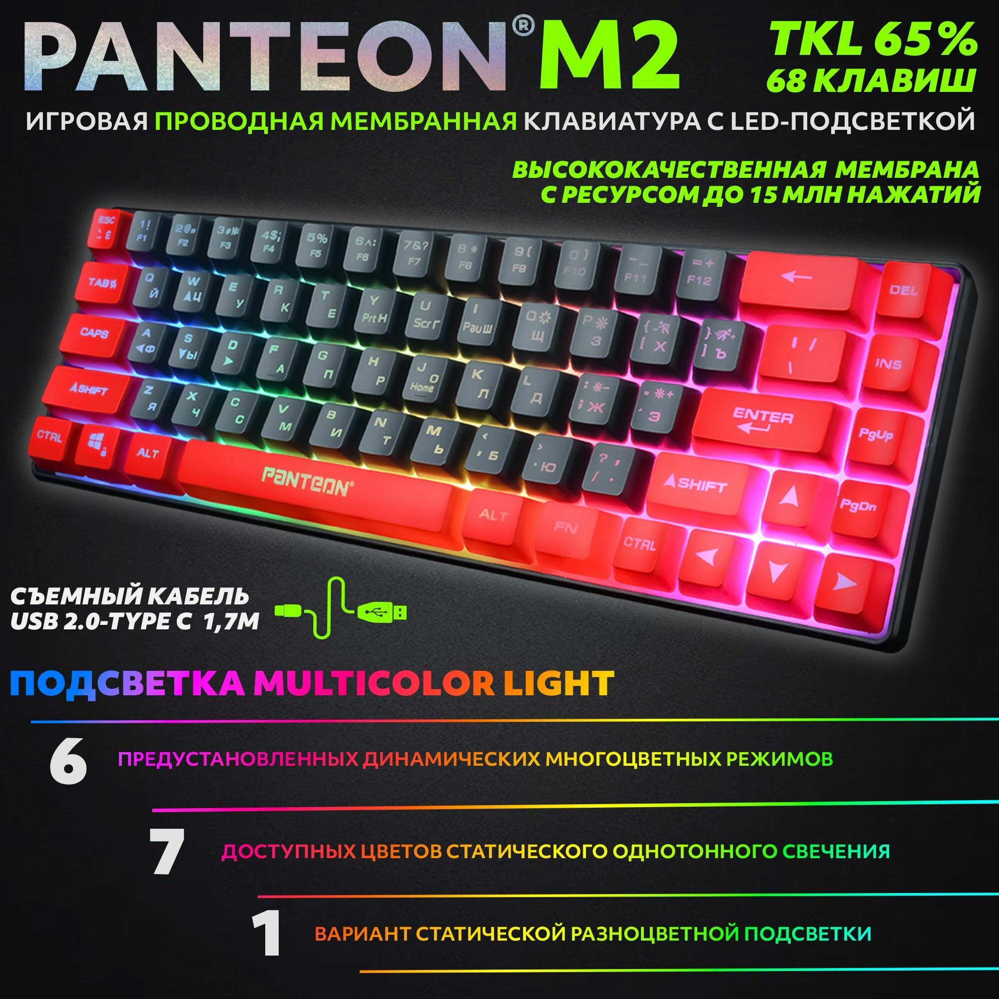 PANTEON M2 Black-Grey(04) Игровая мембранная TKL (65%) клавиатура с LED-подсветкой MULTICOLOR (68 кл.,USB), цвет: черный-серый (04)