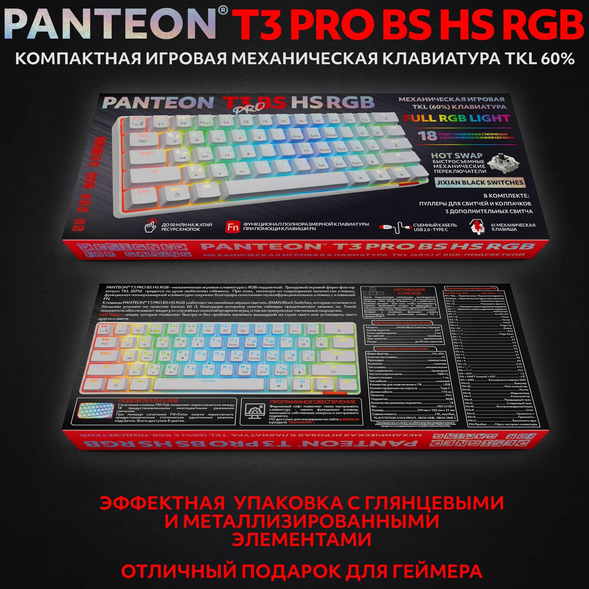 СохранитьPANTEON T3 PRO BS HS RGB White (31) Механическая клавиатура (TKL 60%, подсветка LED RGB, Jixian Black, 61 кл., HotSwap, USB), цвет: белый (31) интересное:
