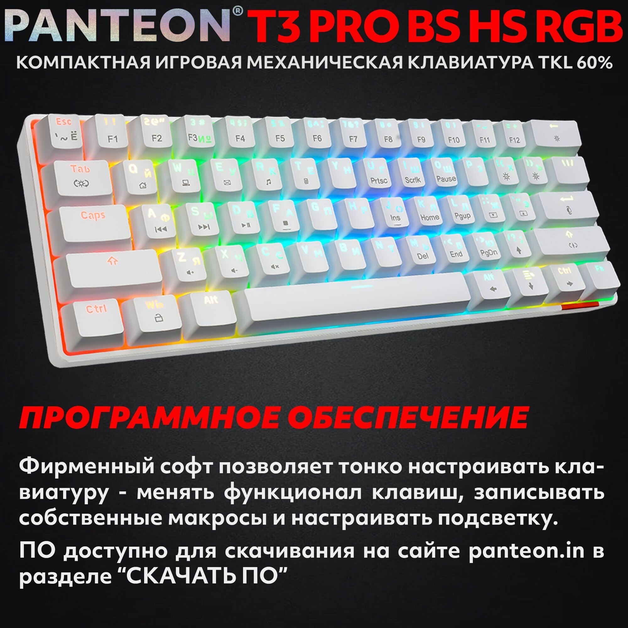 PANTEON T3 RS HS RB White-Grey (37) Механическая клавиатура (TKL 60%, подсветка LED RAINBOW, Jixian Red, 61 кл., HotSwap, USB),цвет: белый-серый (37)