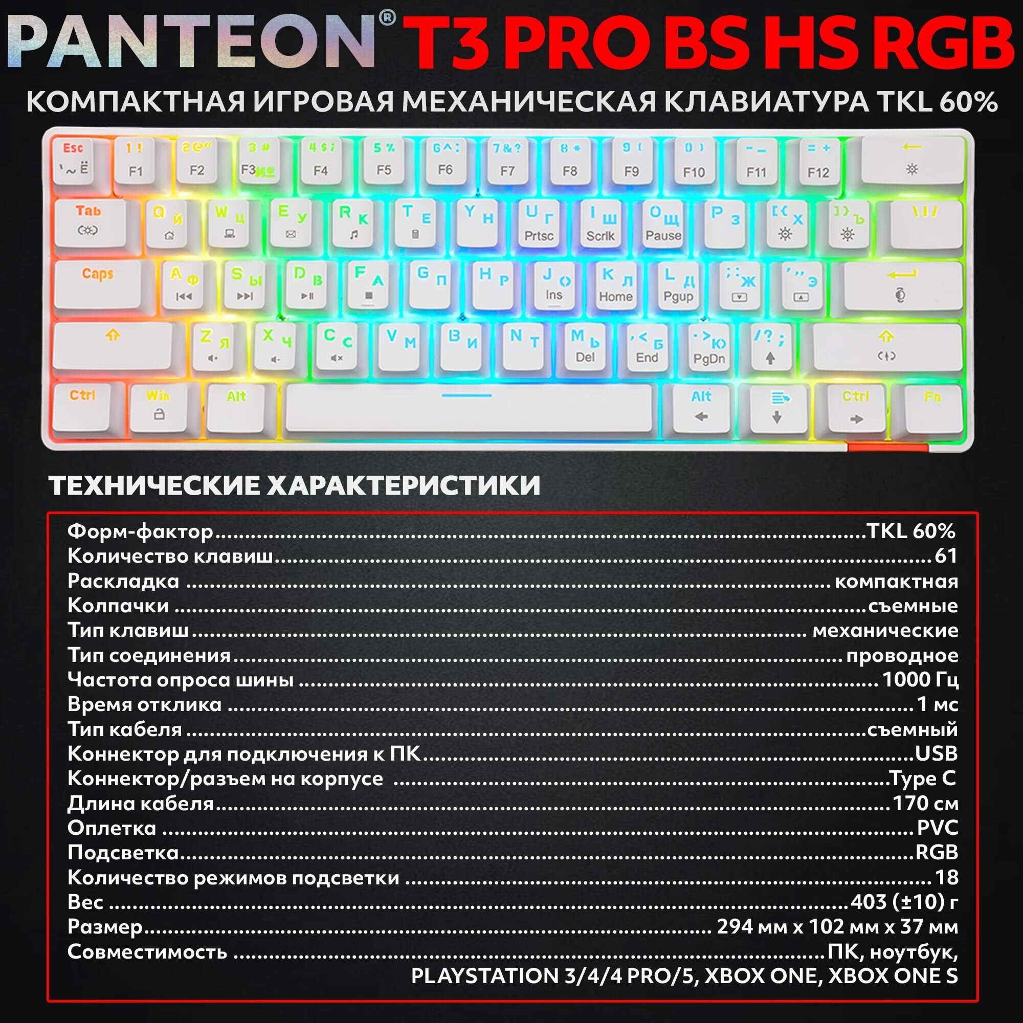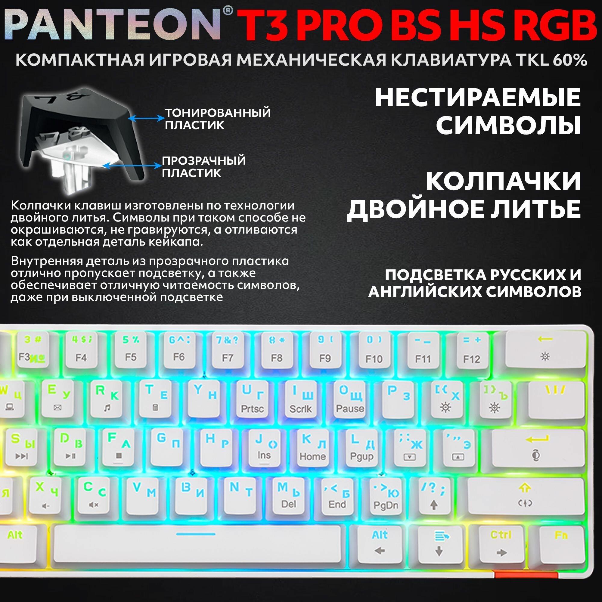 Механическая игровая клавиатура TKL (60%) С led-подсветкой RAINBOW LIGHT PANTEON T3 PRO CK BS белая