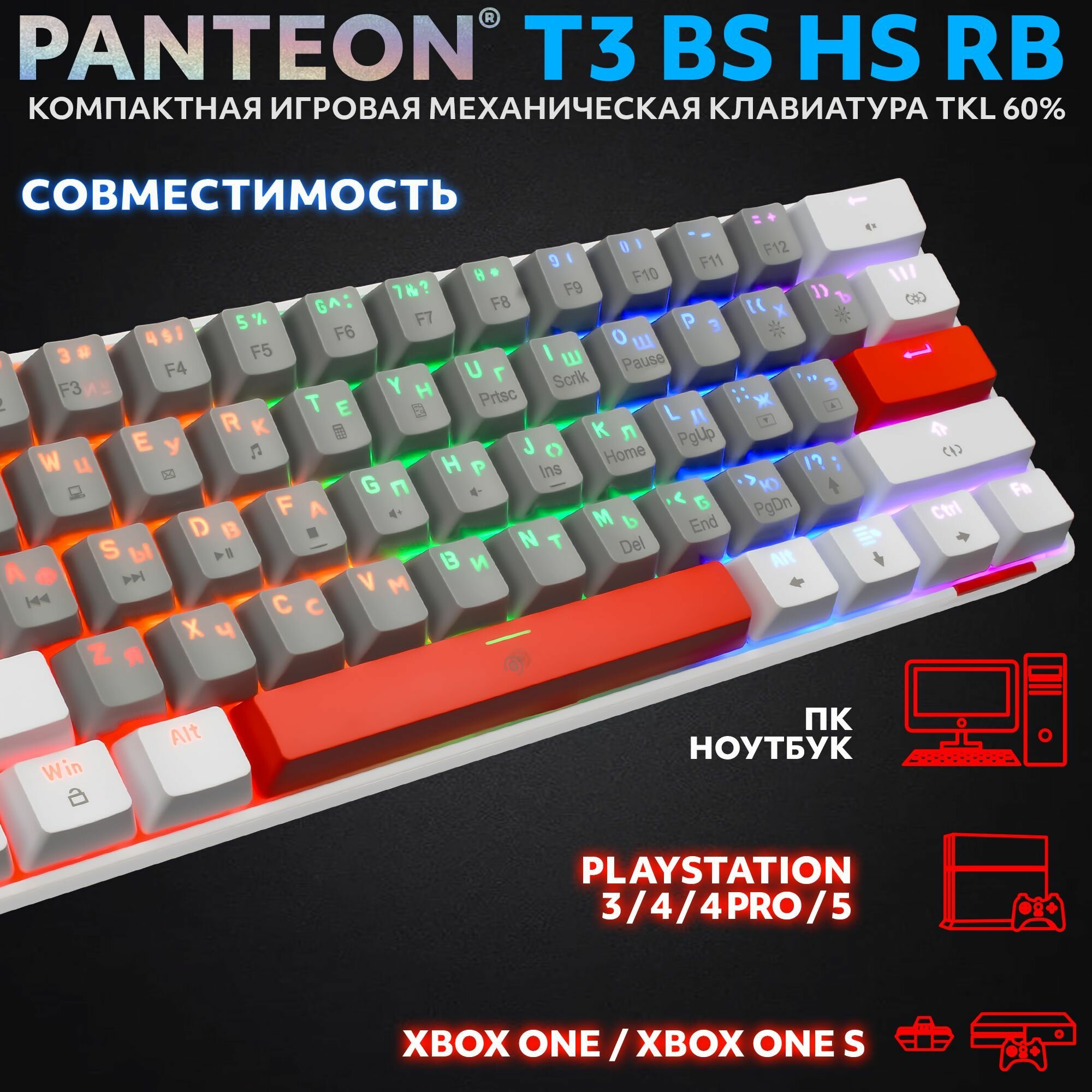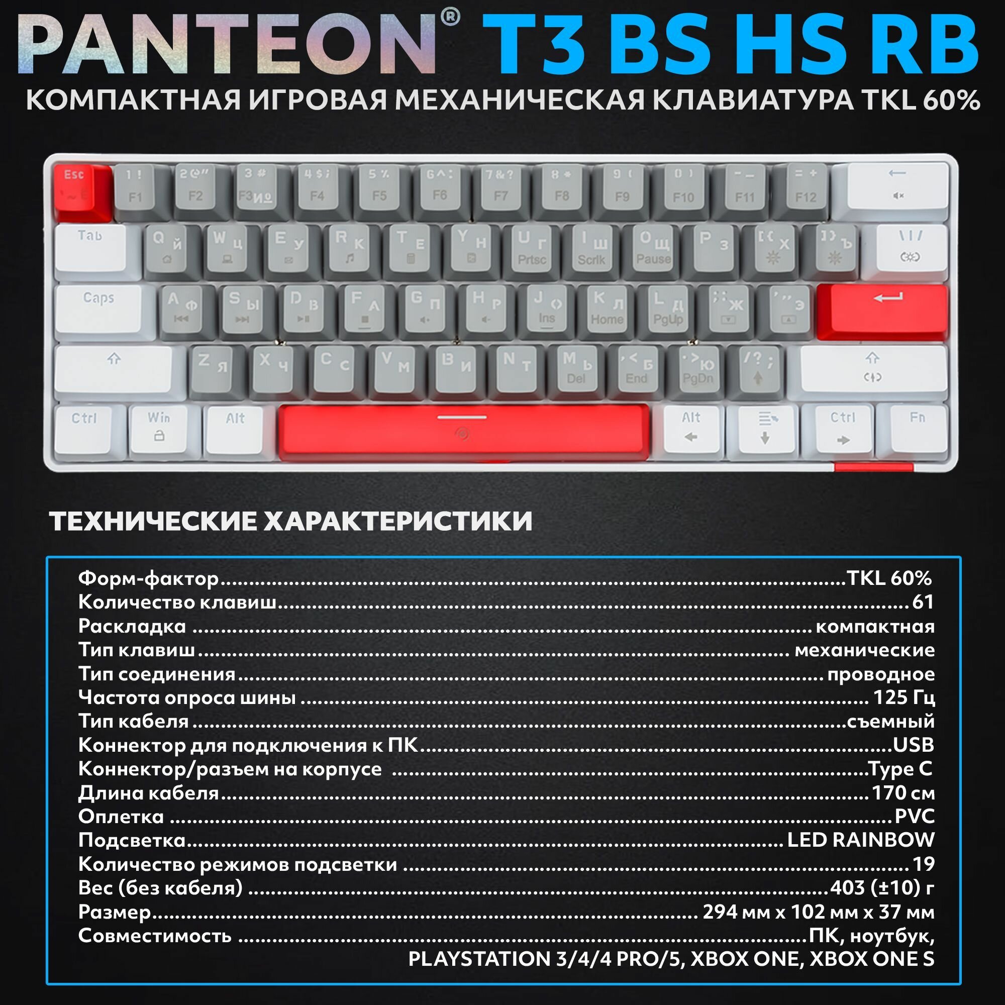 PANTEON T3 RS HS RB White-Grey (37) Механическая клавиатура (TKL 60%, подсветка LED RAINBOW, Jixian Red, 61 кл, HotSwap, USB), цвет: белый-серый (37)
