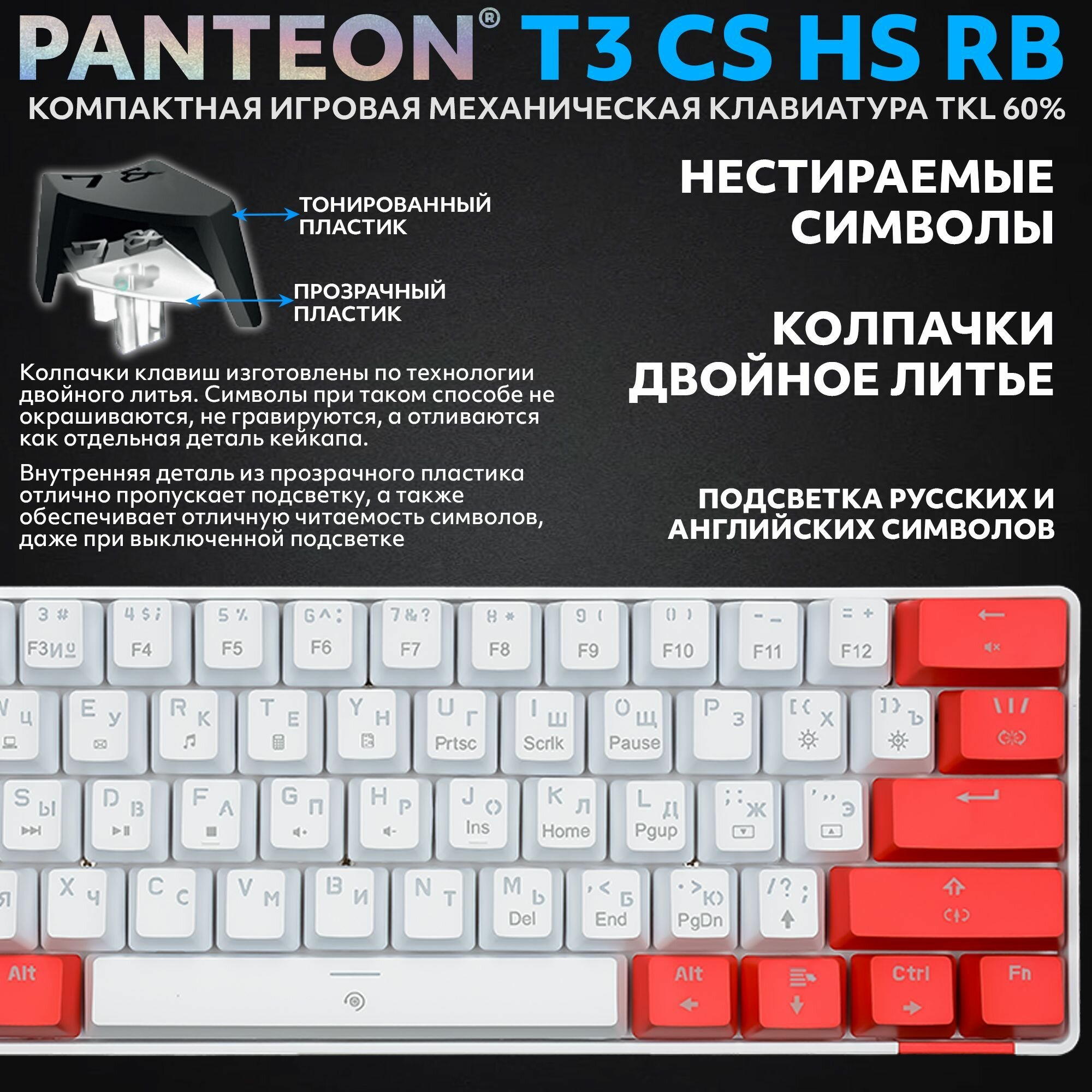 PANTEON T3 RS HS RB White-Grey (37) Механическая клавиатура (TKL 60%, подсветка LED RAINBOW, Jixian Red, 61 кл., HotSwap, USB),цвет: белый-серый (37)