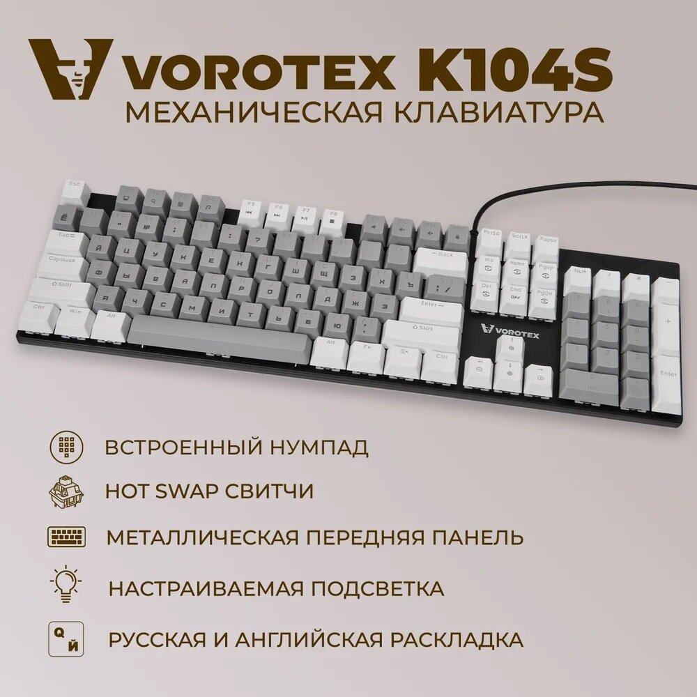 Клавиатура игровая проводная VOROTEX K104S Red Switch, русская раскладка (Серый, белый)