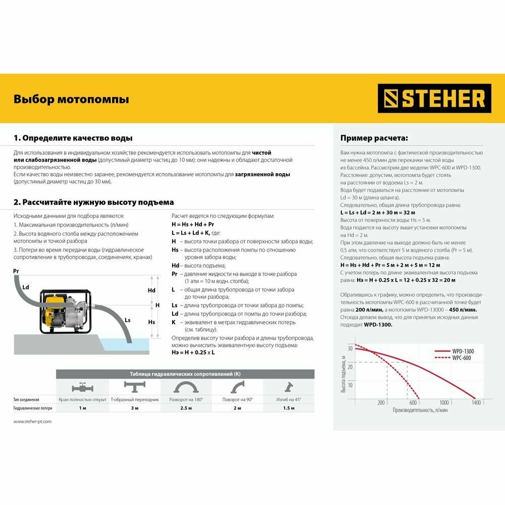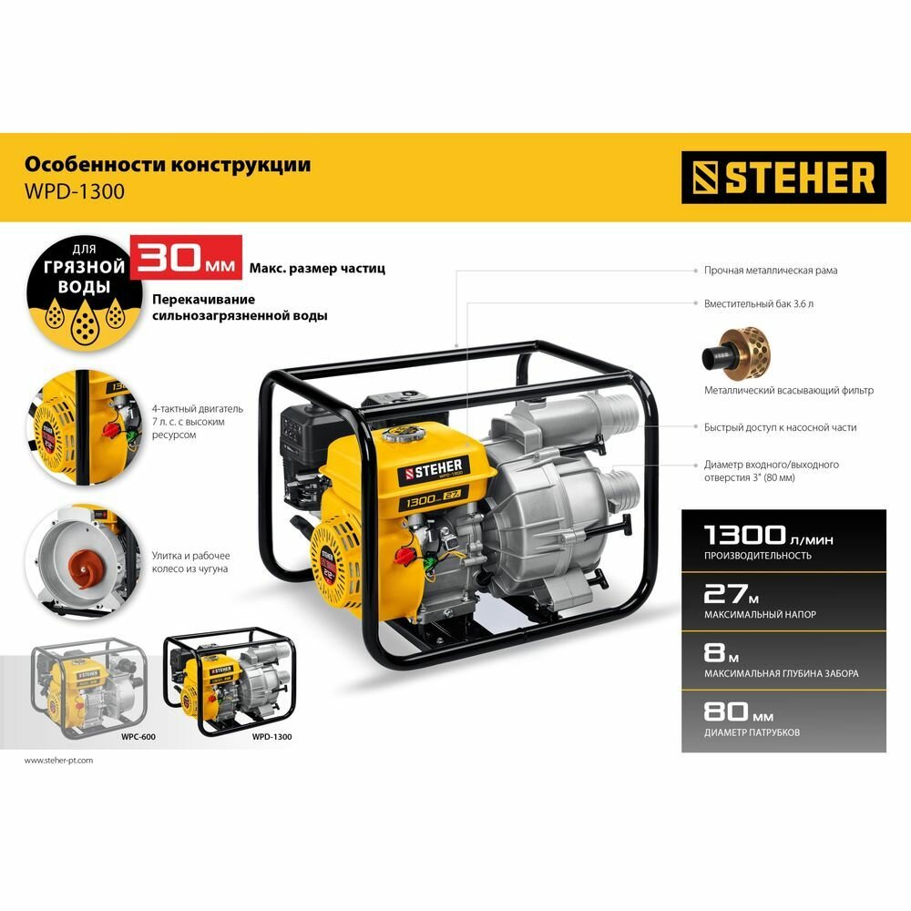 STEHER 1300 л/мин, мотопомпа бензиновая для грязной воды (WPD-1300) интересное:
