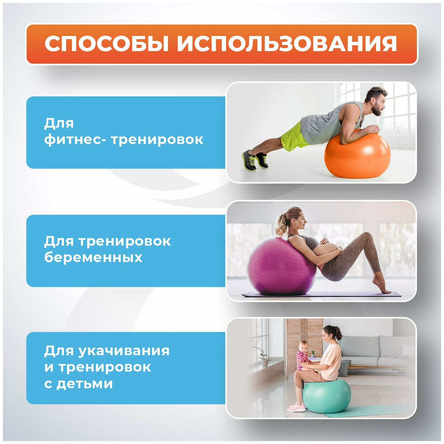| Дополнительная информация | Имеет две части - массажную с пупырышками и обычную гладкую ; мяч из гипоаллергенного вспененного ПВХ с эффектом антивзрыв ; можно сидеть, прыгать, качаться ; нагрузка до 300кг; возраст: для взрослых |