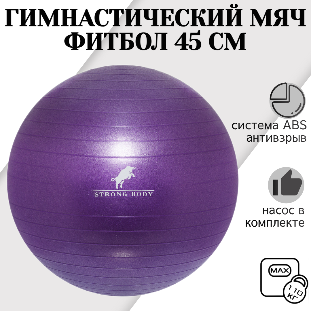 Купить Фитбол 45 см ABS антивзрыв STRONG BODY, фиолетовый, насос в комплекте (гимнастический мяч для фитнеса)