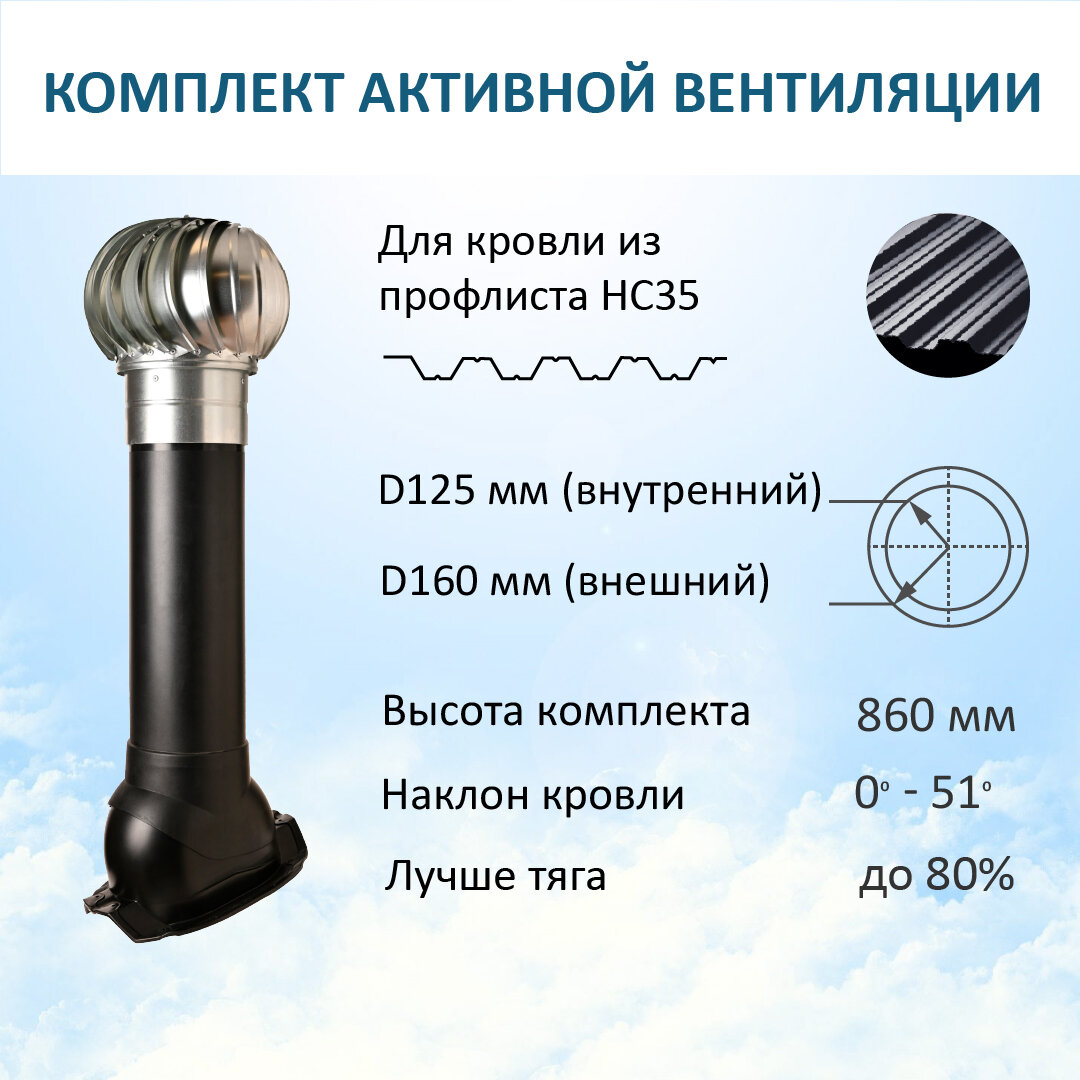 Комплект активной вентиляции: Турбодефлектор TD160 ОЦ, вент. выход утепленный высотой Н-700, для кровельного профнастила 35мм, черный интересное:
