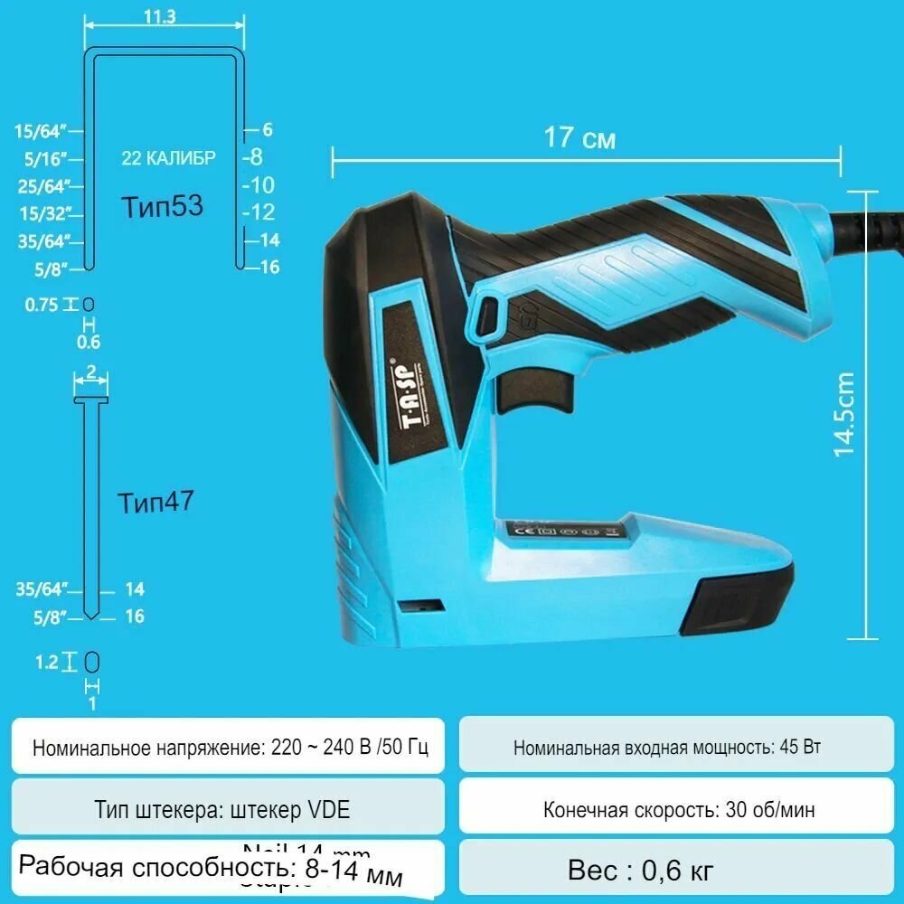 Степлер электрический TASP MESG45, скоба: 8-14 мм, гвоздь: 15 мм, 45 Вт интересное: